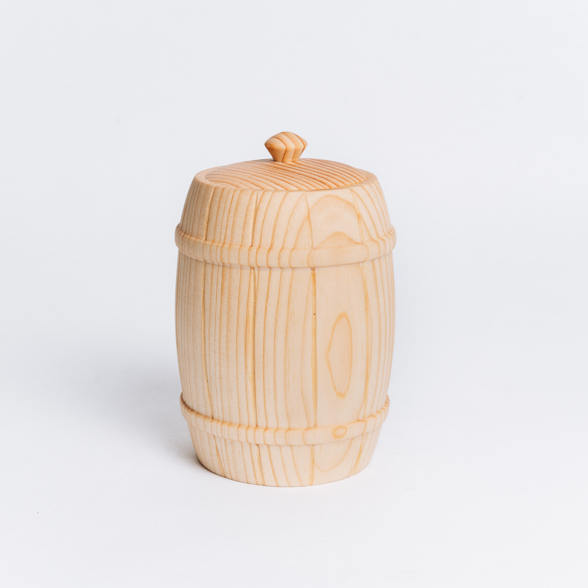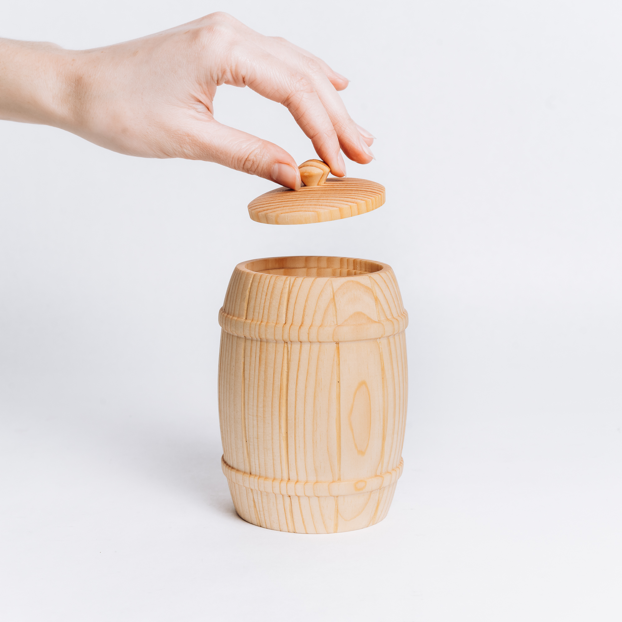 Маленькая кубышка в виде бочонка из массива натурального сибирского Кедра. Для соли, специй, меда или других пищевых продуктов. Снаружи и внутри пропитана горячим растительным маслом с пчелиным воском.