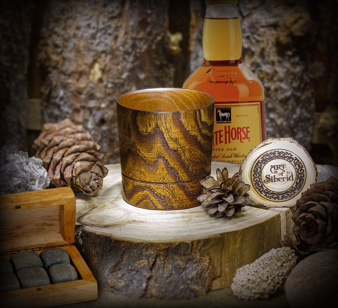 Виски - это крепкий ароматный алкогольный напиток, имеющий долгую историю. Виски пьют и как аперитив, и как дижестив. Поскольку это элитный и роскошный алкоголь, который называют даже напитком президентов и премьер-министров, то и посуда для его употребления должна соответствовать марке. Самый распространённый бокал для виски - это tumbler. Существует предание, что появился он впервые в Америке, в барах Дикого Запада. Посетители этих заведений любили в большом количестве бить посуду, и владельцы, чтобы не терпеть убытки, разрезали бутылки пополам и в нижней части подавали напиток. Поэтому современный стакан для виски имеет толстое дно. Мы предлагаем вам ощутить вкус и аромат благородного напитка в бокалах из дерева. Эти уникальные бокалы для виски ручной работы, сделанные из цельного массива дерева. Древесина сибирского вяза смягчает вкус, одновременно усиливая древесные нотки виски и делая его аромат более насыщенным. Бокалы созданы сибирскими мастерами для истинных гурманов и ценителей вкуса! Сохранена текстура древесины сибирского вяза, которая придает этим бокалам неповторимый роскошный вид. Но не забудьте, что чрезмерное употребление алкоголя вредит вашему здоровью.