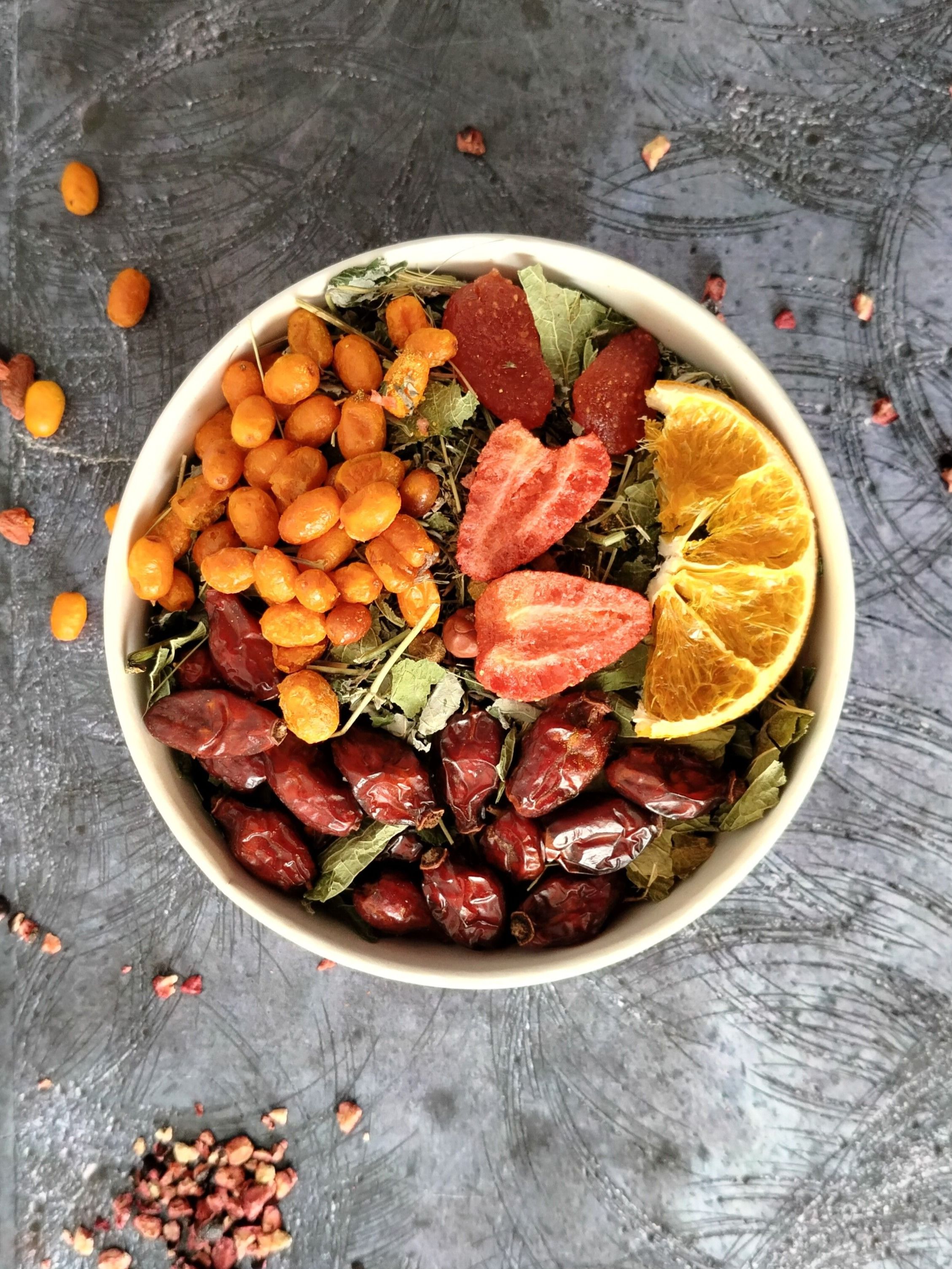 Состав: лист чёрной смородины, лист малины, облепиха, цедра апельсина молотая, клубника, чабрец.
