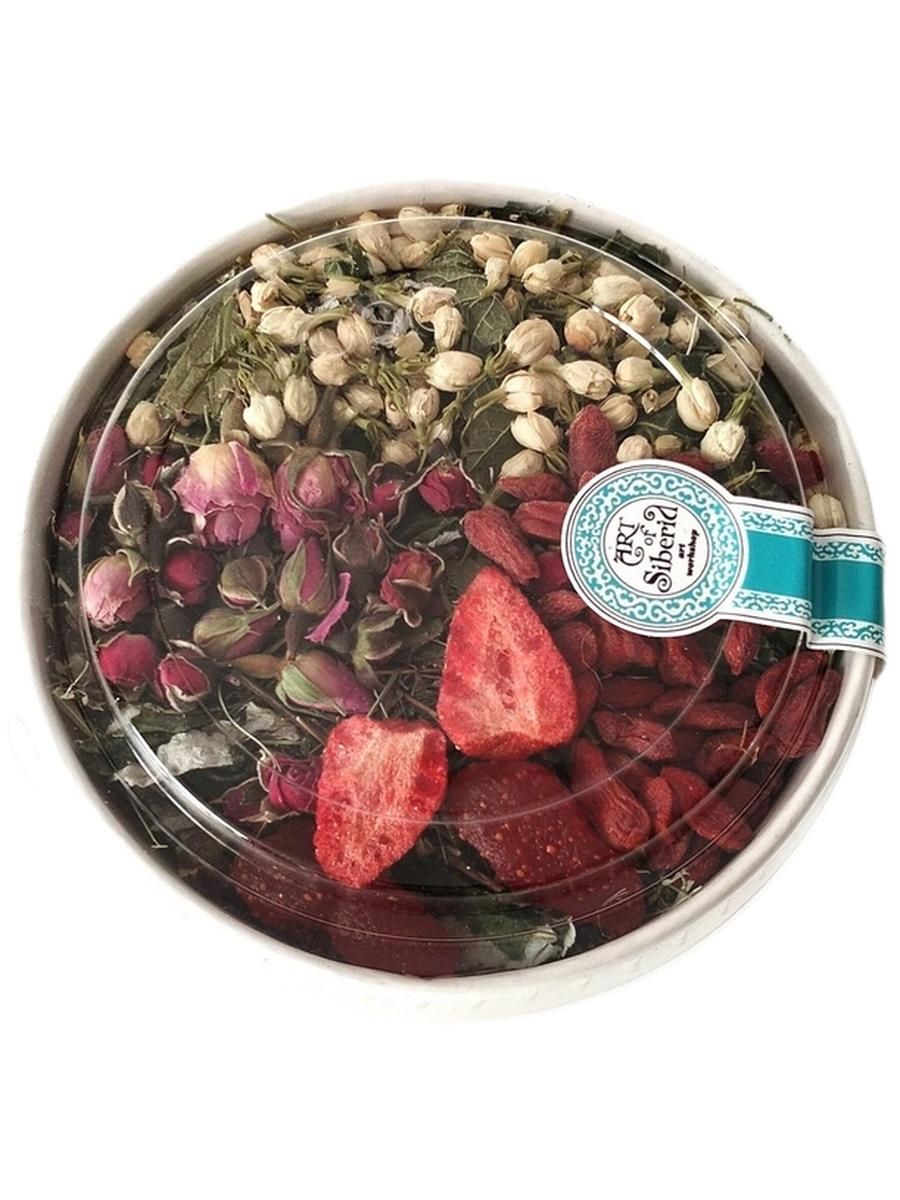 Жасмин в составе чая придает ему легкий, цветочный аромат, который помогает снять стресс и улучшить настроение. Бутоны роз добавляют напитку изысканный вкус и аромат, а также обладают успокаивающими и расслабляющими свойствами. Малина и клубника придают чаю сладковатый вкус и содержат множество витаминов и антиоксидантов, которые поддерживают здоровье и иммунитет. Лист смородины добавляет чаю свежесть и легкий кисловатый вкус, а чабрец (тимьян) обладает антисептическими и противовоспалительными свойствами.