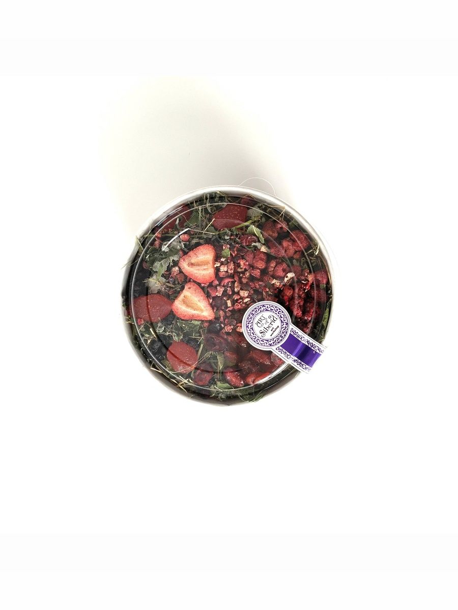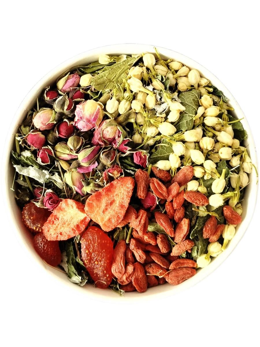 Травяной чай с жасмином, бутонами роз, малиной, листом смородины, клубникой и чабрецом — это уникальный и ароматный напиток, который сочетает в себе множество полезных ингредиентов. Этот чай не содержит кофеина и идеально подходит для тех, кто ищет расслабляющий и успокаивающий напиток.