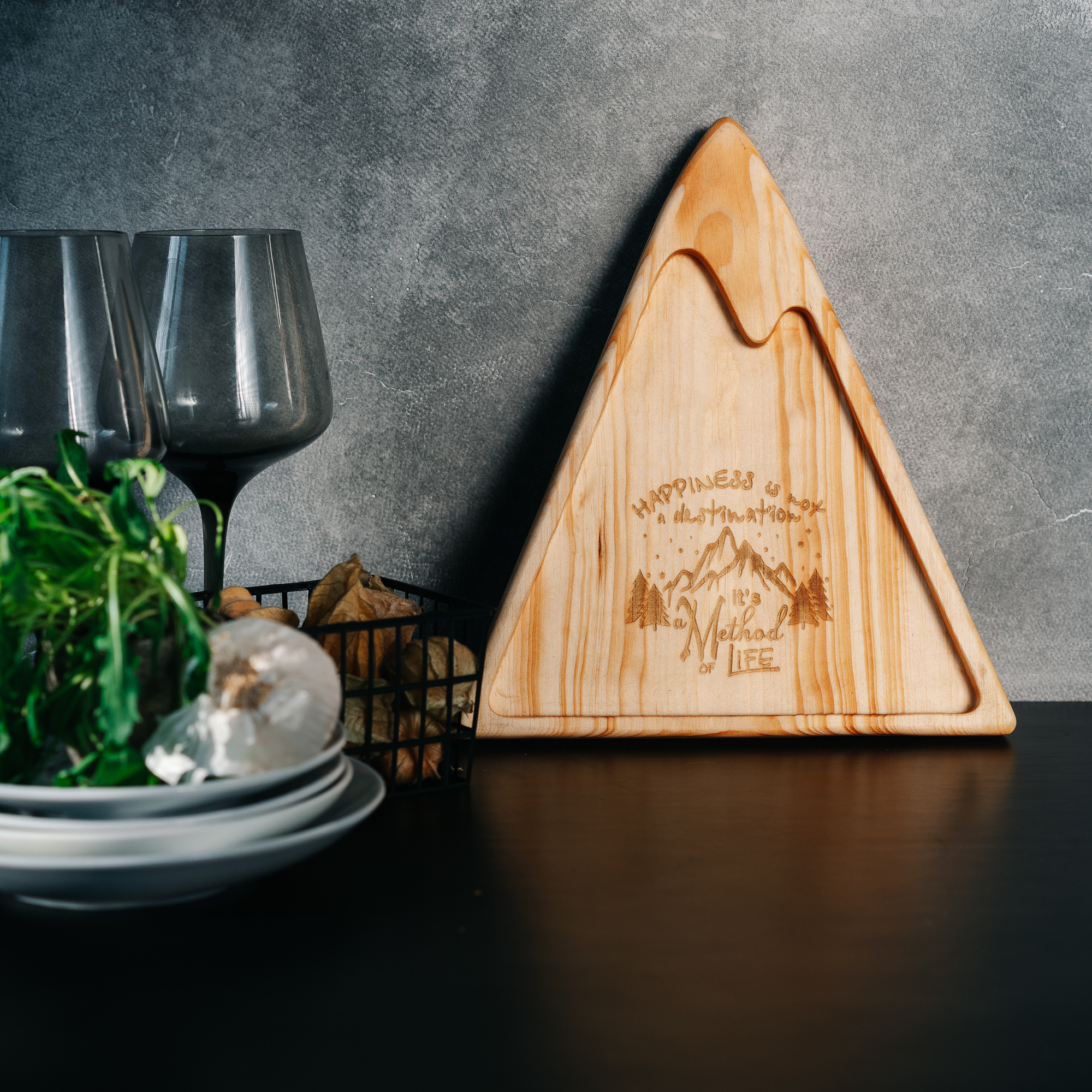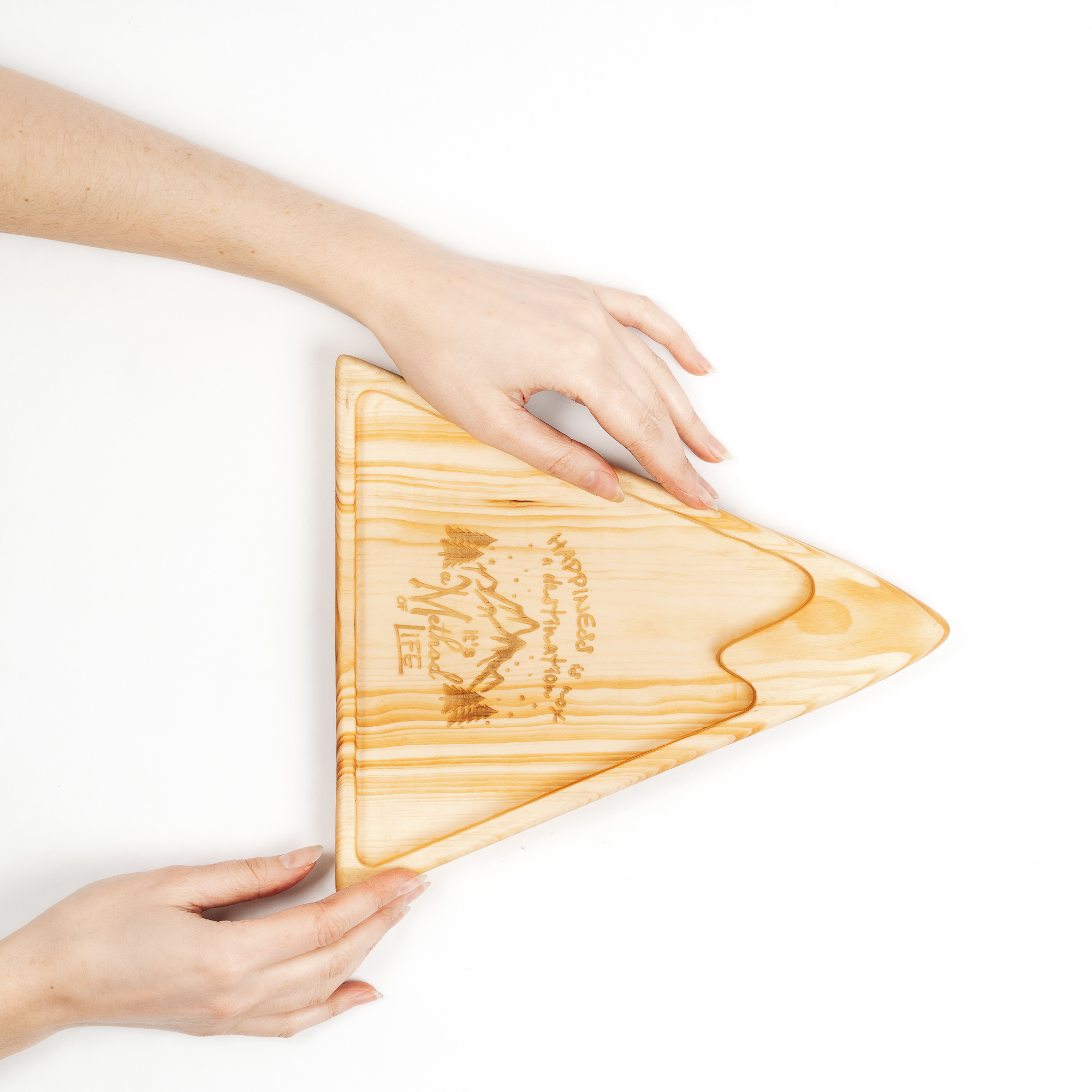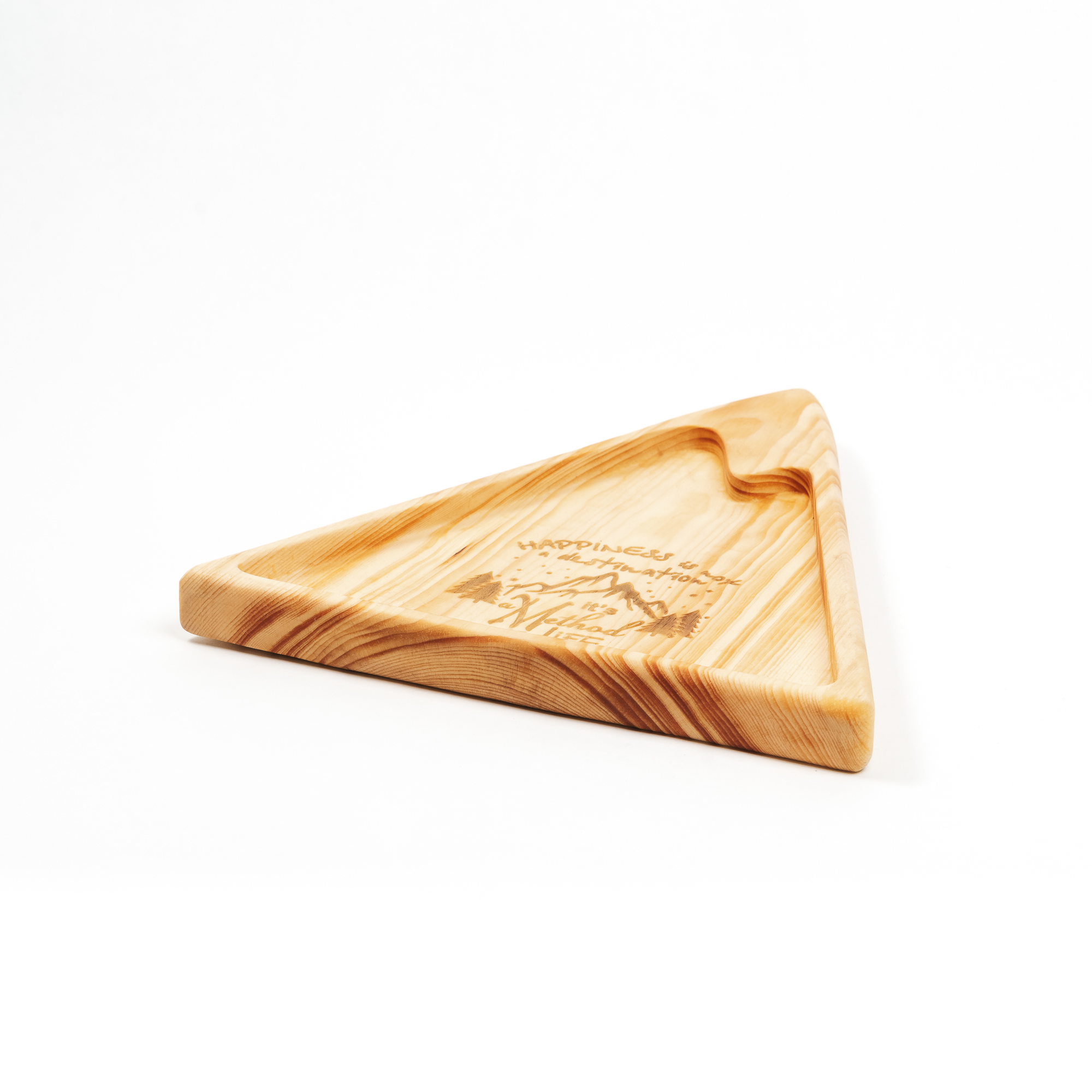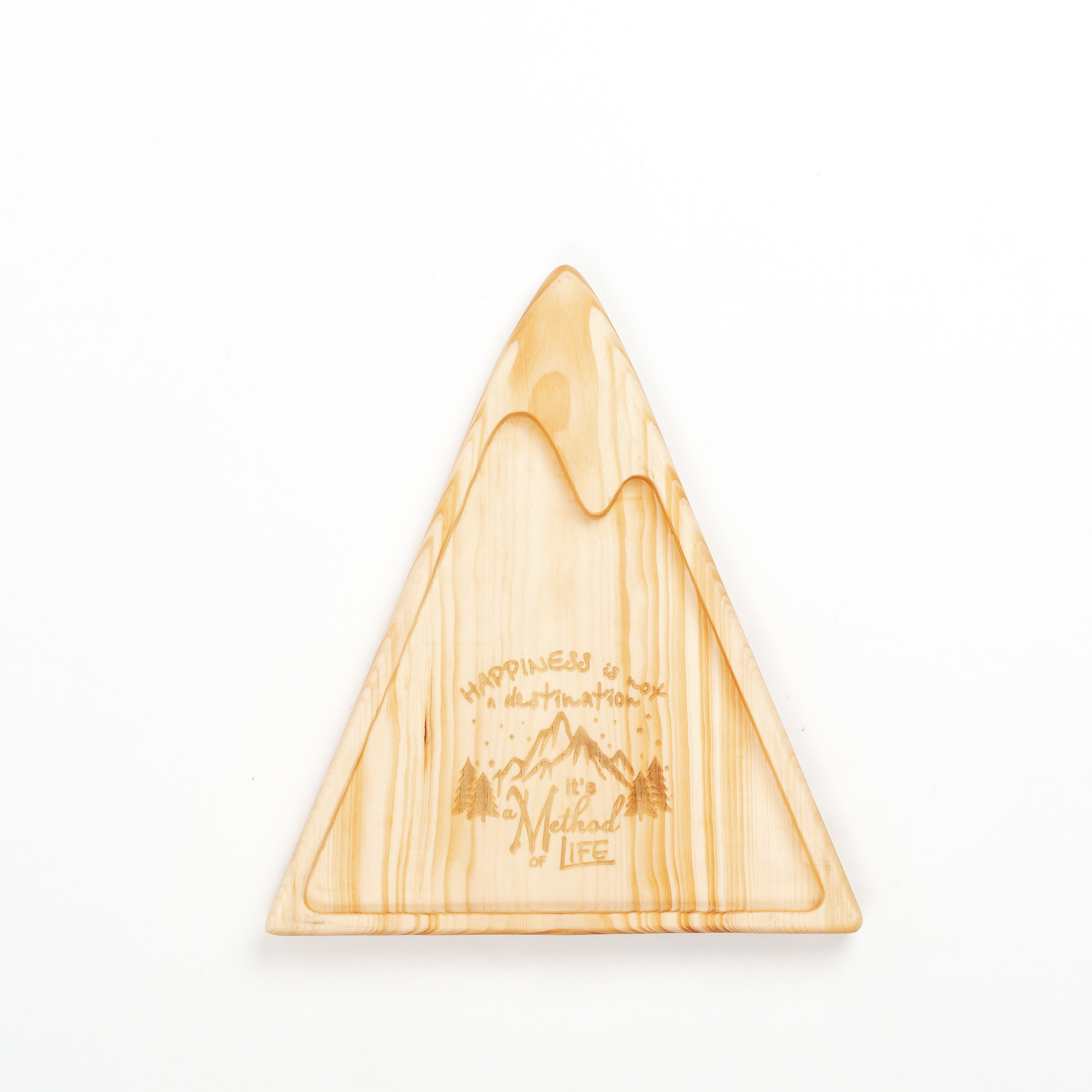 Деревянная менажница "горы" из кедра для подачи блюд и закусок с гравировкой "HAPPINESS is not a destination, it is a Method of life". Любителям натуральности придется по душе наша деревянная менажница, имеющая такие плюсы, как красивый узор древесины, не бьется, натуральна, долговечна и подходит для различных блюд. А антибактериальные свойства кедра привлекают ценителей чистоты. Подходит для всех видов закусок! Возможно наличие сучков. Пропитана нашим составом на основе растительного масла, кедровой смолы и пчелиного воска.