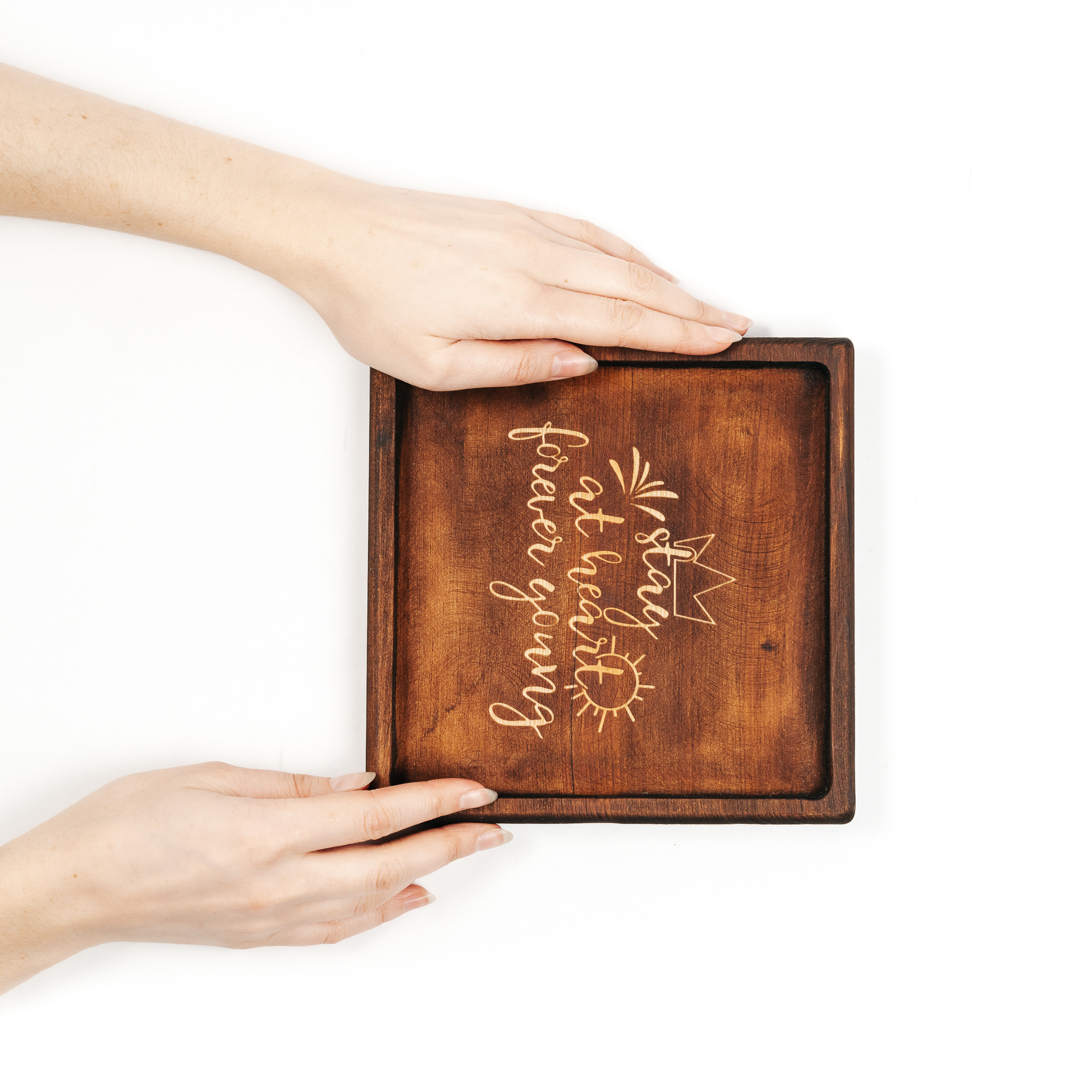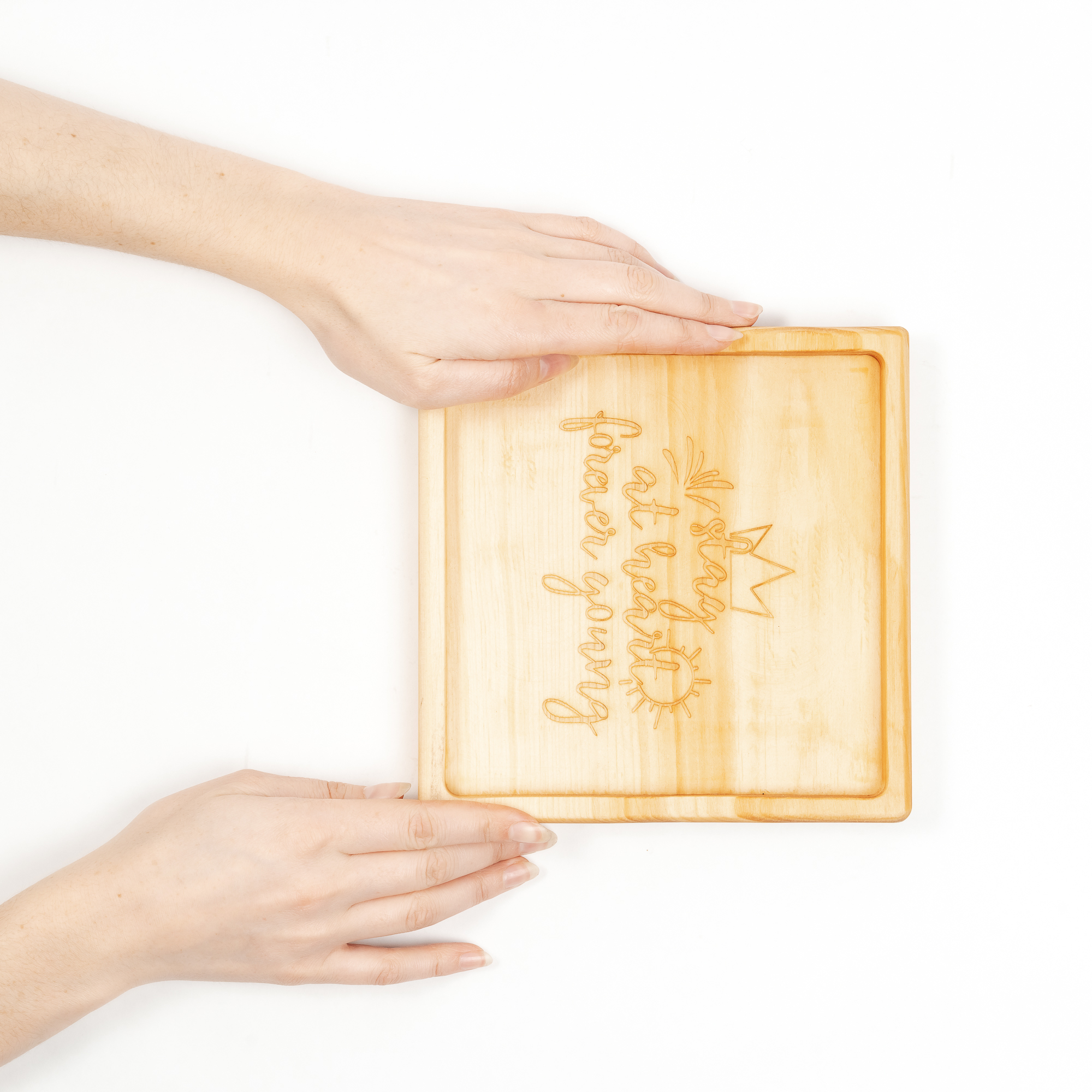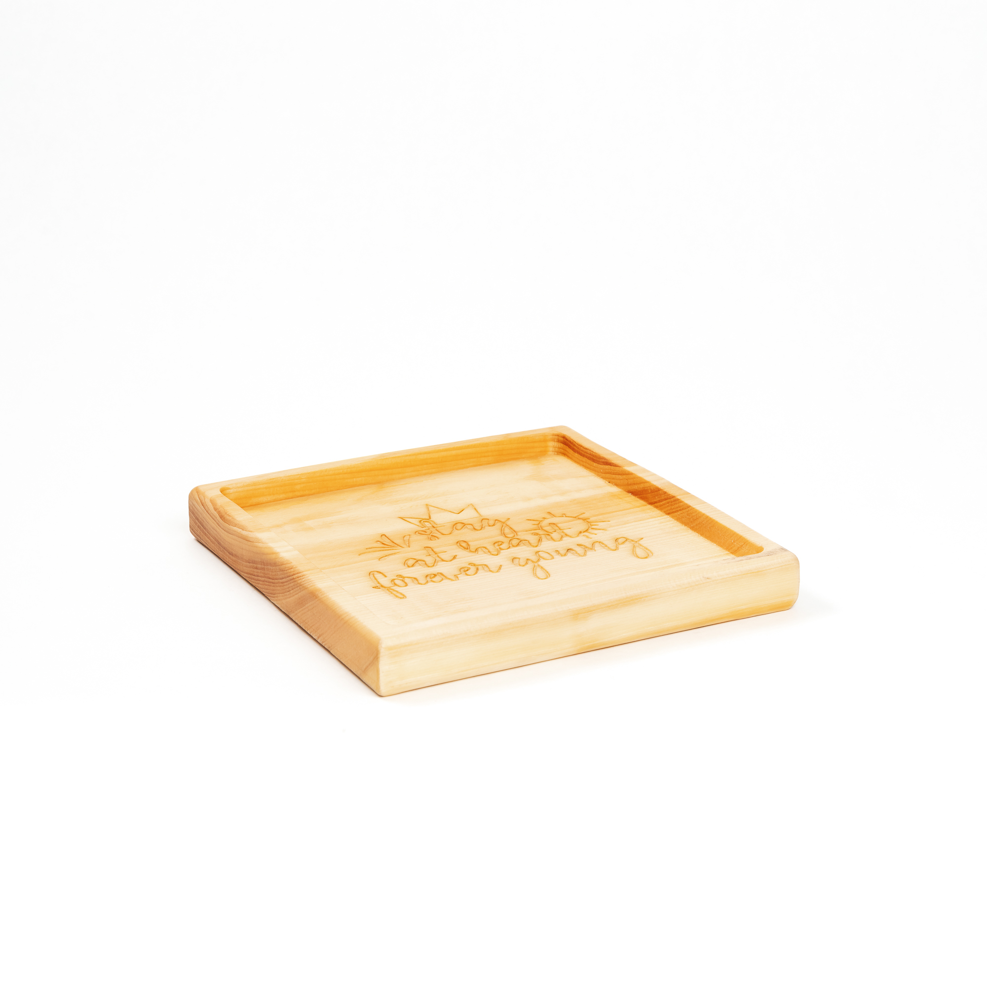 Деревянная менажница из кедра для подачи блюд и закусок с гравировкой "Stay at heart forever going". Любителям натуральности придется по душе наша деревянная менажница, имеющая такие плюсы, как красивый узор древесины, не бьется, натуральна, долговечна и подходит для различных блюд. А антибактериальные свойства кедра привлекают ценителей чистоты. Подходит для любых видов закусок: от мясной нарезки до конфет! Пропитана нашим составом на основе растительного масла, кедровой смолы и пчелиного воска.