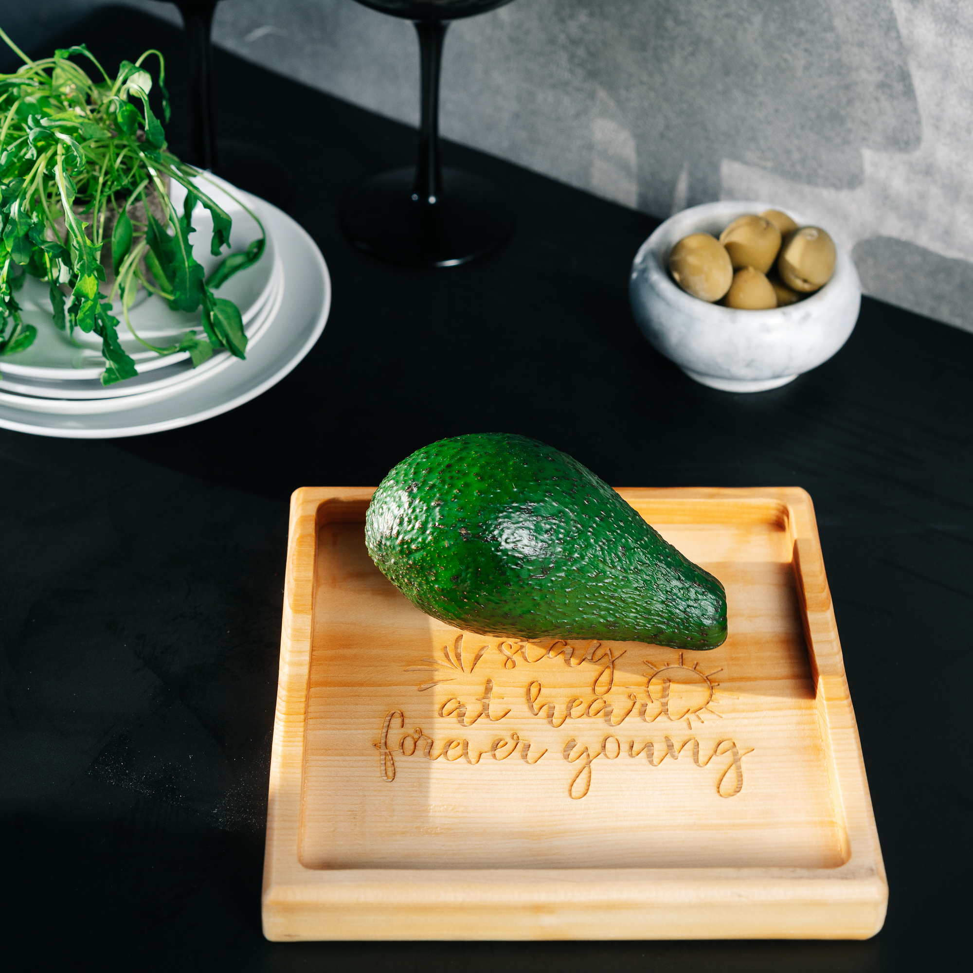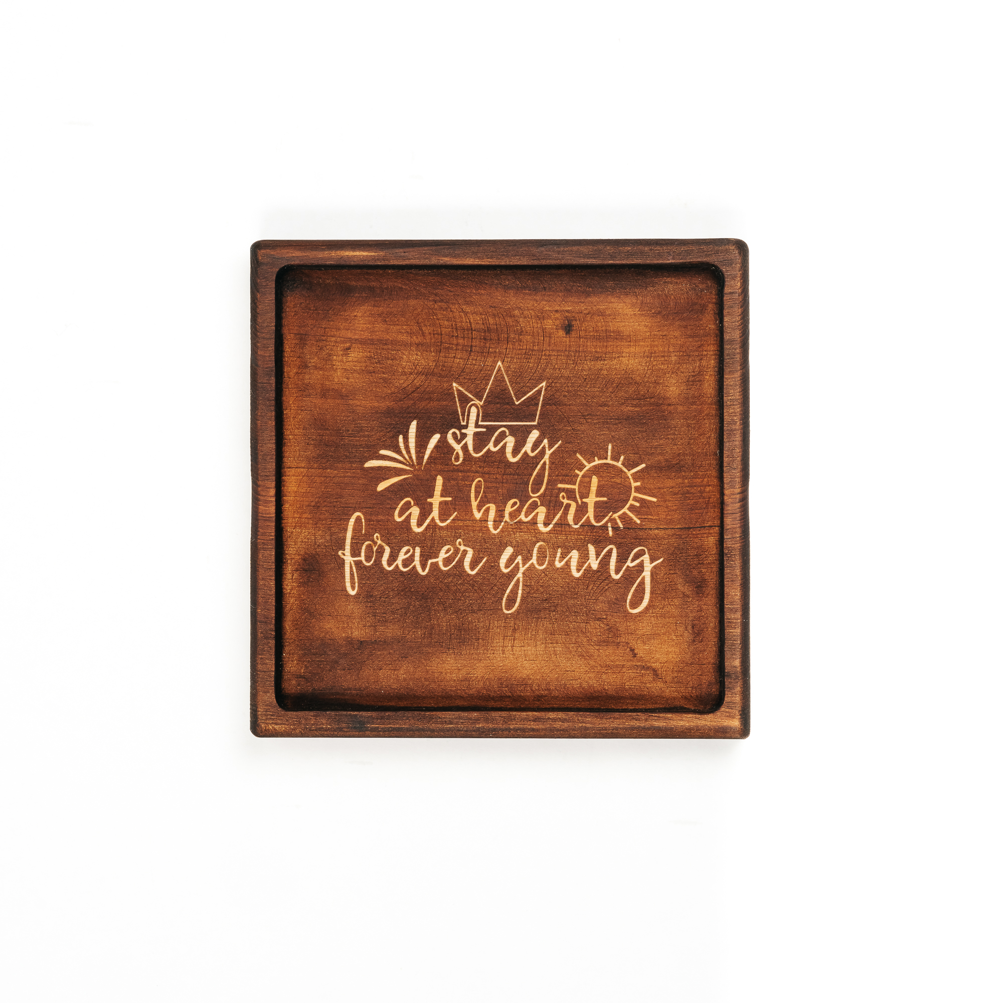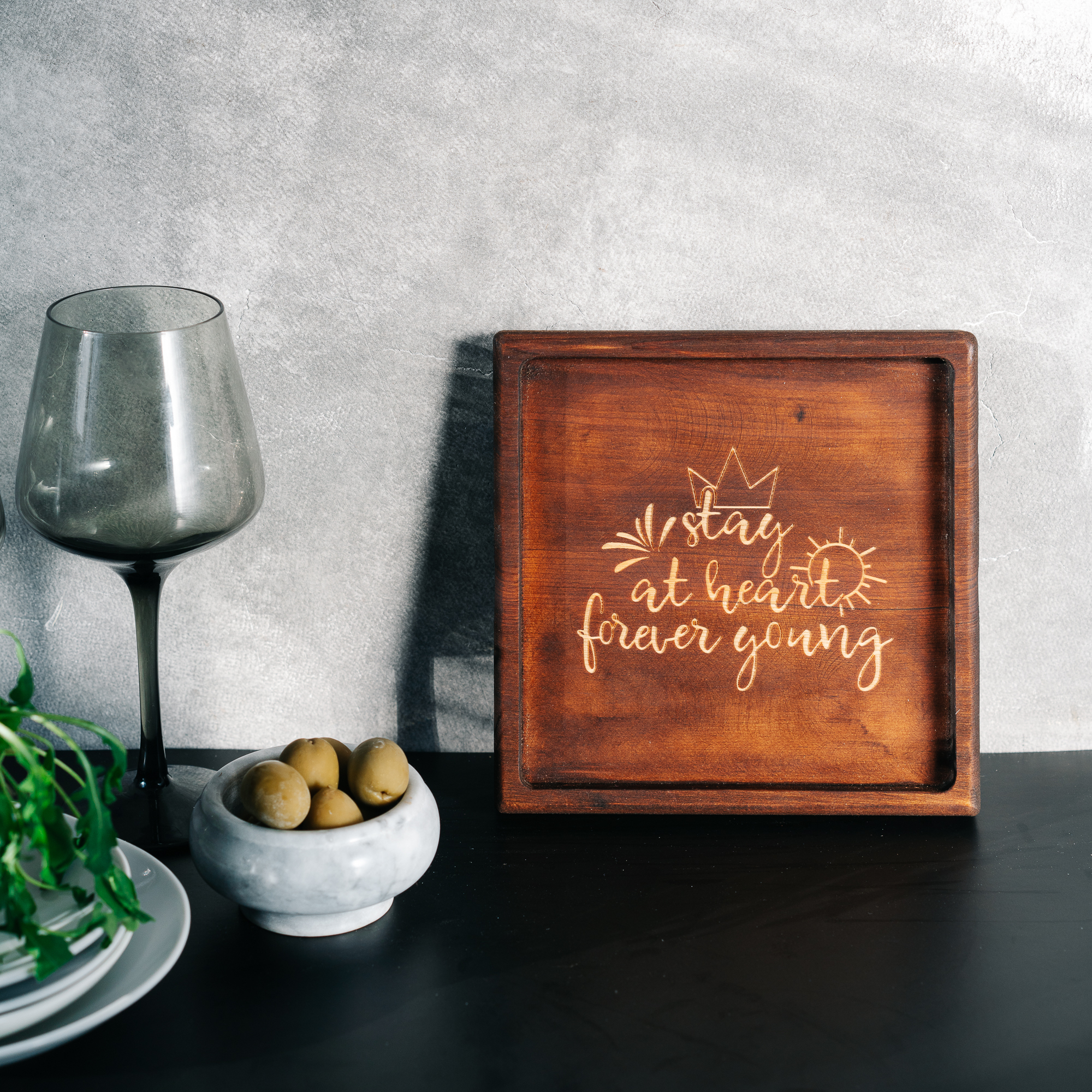 Деревянная менажница из кедра для подачи блюд и закусок с гравировкой "Stay at heart forever going". Любителям натуральности придется по душе наша деревянная менажница, имеющая такие плюсы, как красивый узор древесины, не бьется, натуральна, долговечна и подходит для различных блюд. А антибактериальные свойства кедра привлекают ценителей чистоты. Подходит для любых видов закусок: от мясной нарезки до конфет! Пропитана нашим составом на основе растительного масла, кедровой смолы и пчелиного воска.