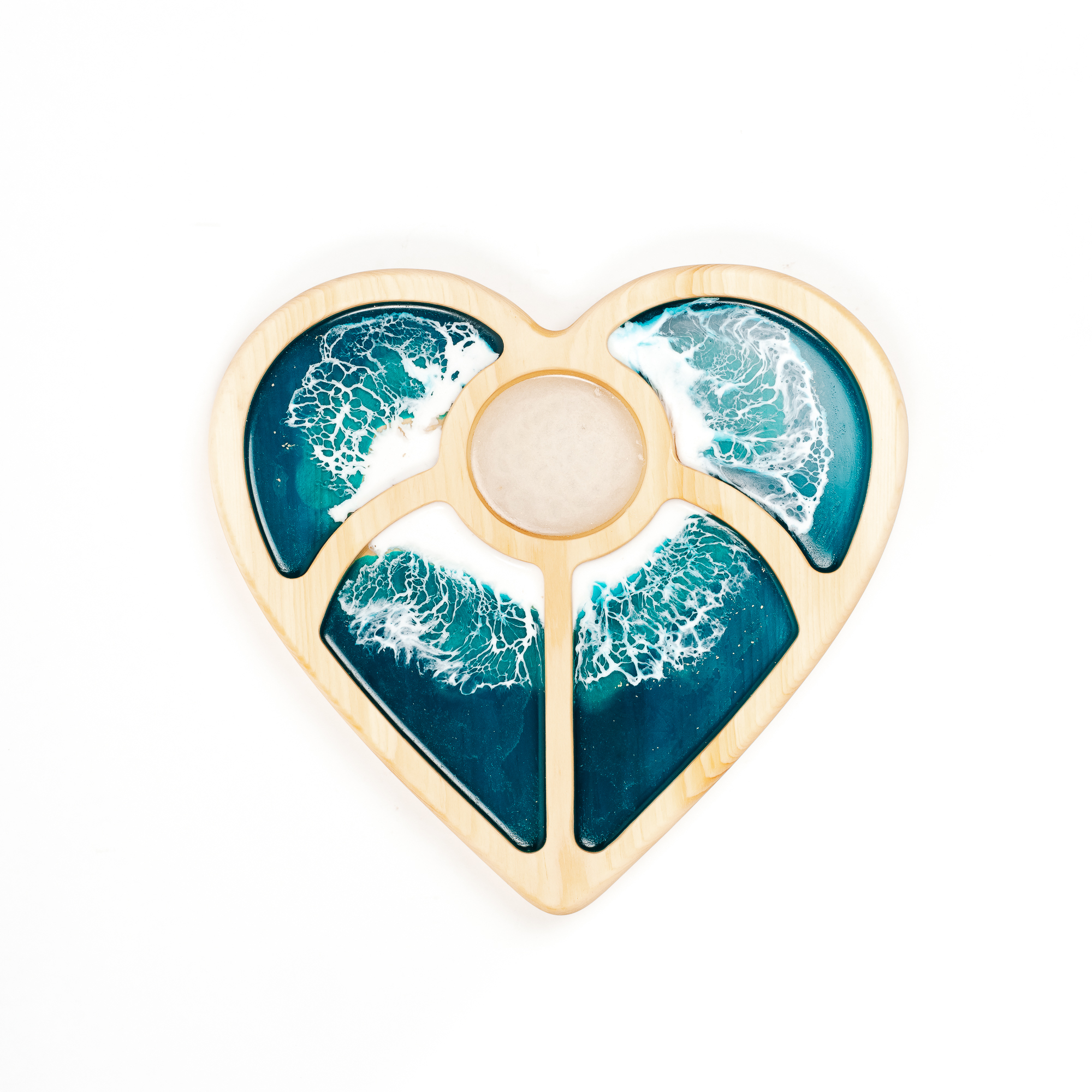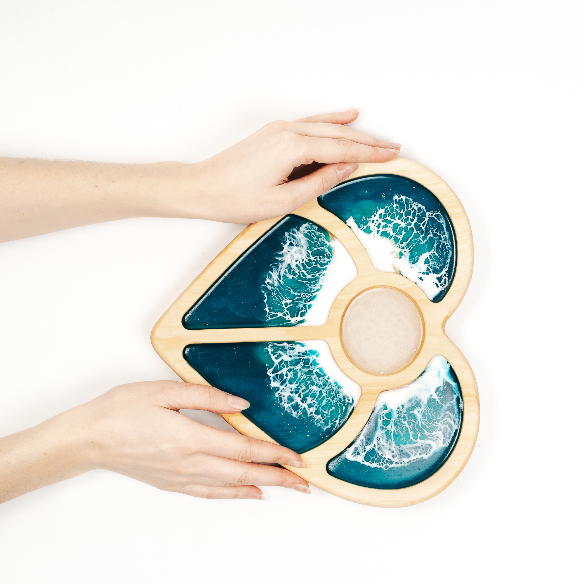 Деревянная менажница из кедра с эпоксидной смолой "Сердце". Любителям натуральности придется по душе наша деревянная менажница, имеющая такие плюсы, как красивый узор древесины, не бьется, натуральна, долговечна и подходит для различных блюд. А антибактериальные свойства кедра привлекают ценителей чистоты. Подходит для любых закусок! Возможно наличие сучков. Пропитана нашим составом на основе растительного масла, кедровой смолы и пчелиного воска.