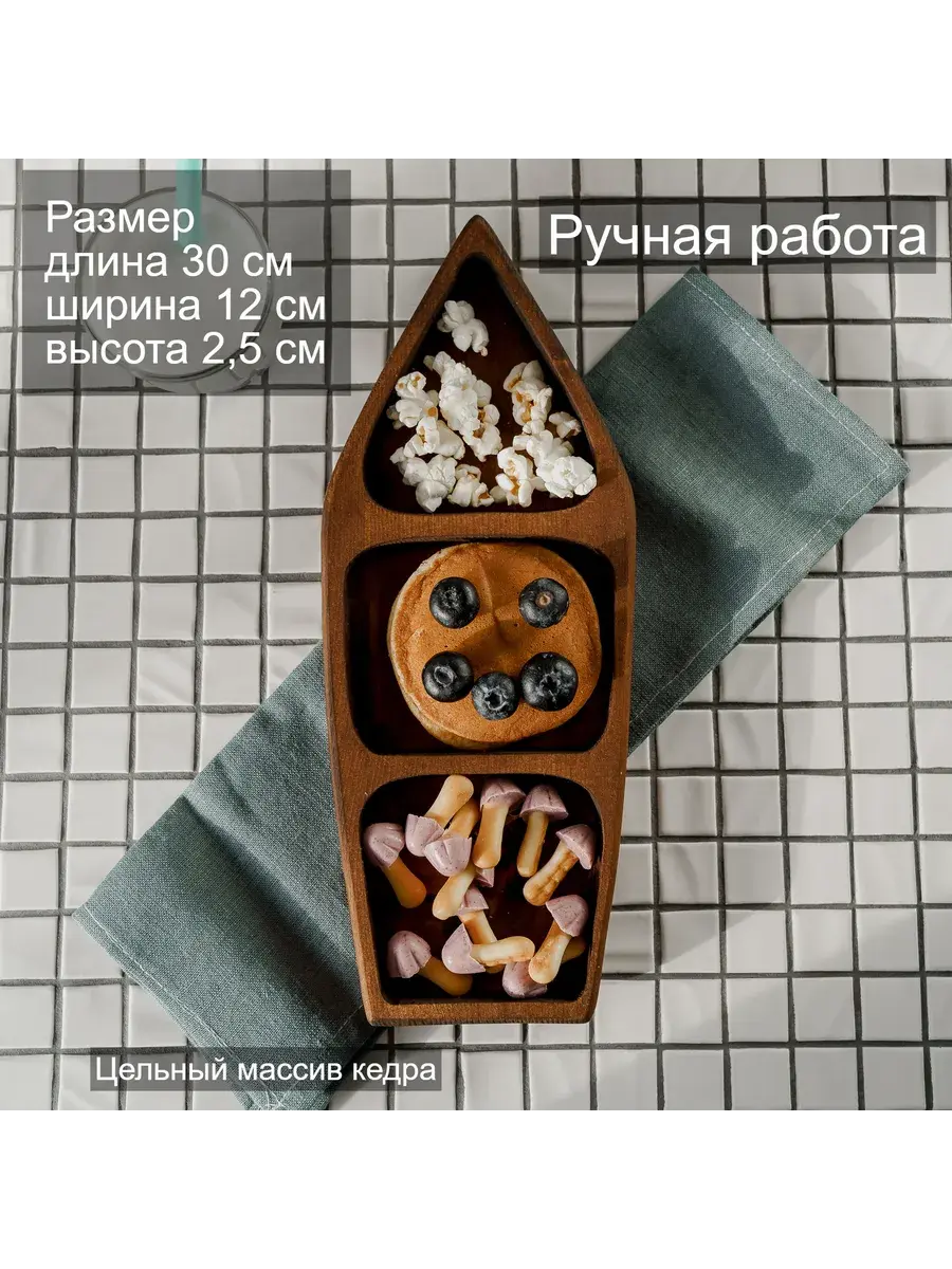 Менажница деревянная цельная из Сибирского кедра ручной работы для кухни. Выполнена из 100% массива, полностью цельная. Многие хозяйки мечтают, чтобы ее семейный обед или праздничный ужин был таким, как в престижном дорогом ресторане, поэтому озадачиваются сервировкой и красивой подачей блюд. В этом случае можно воспользоваться нашей новинкой - менажница для подачи блюд! Менажница – это тарелка, на которой смешаны разные блюда. Наша экологичная посуда из дерева придется по душе каждому, кто любит вкусно поесть и получить удовольствие от еды. Деревянная менажница для сервировки обладает следующими преимуществами: красивая текстура древесины, очень прочная, натуральная и долговечная. Фитонциды, входящие в состав кедровой древесины, имеют антибактериальные свойства. Они способны обеззараживать воздух, убивать простейшие микроорганизмы и вирусы. Поднос из дерева станет отличным подарком на Новый год, день рождения и новоселье. Менажница подходит для горячих и холодных блюд, для сыра, для закусок и фруктов. Возможно наличие сучков. Идеальная шлифовка позволяет изделию быть очень гладким. Менажница пропитана натуральным маслом, которое, необходимо смыть в теплой проточной воде перед использованием. Не замачивать! Не использовать в посудомоечной машине! Только деликатная мойка. После использования насухо вытереть. Размеры менажницы: Длина 300 мм, Ширина 120 мм, Высота 25 мм.