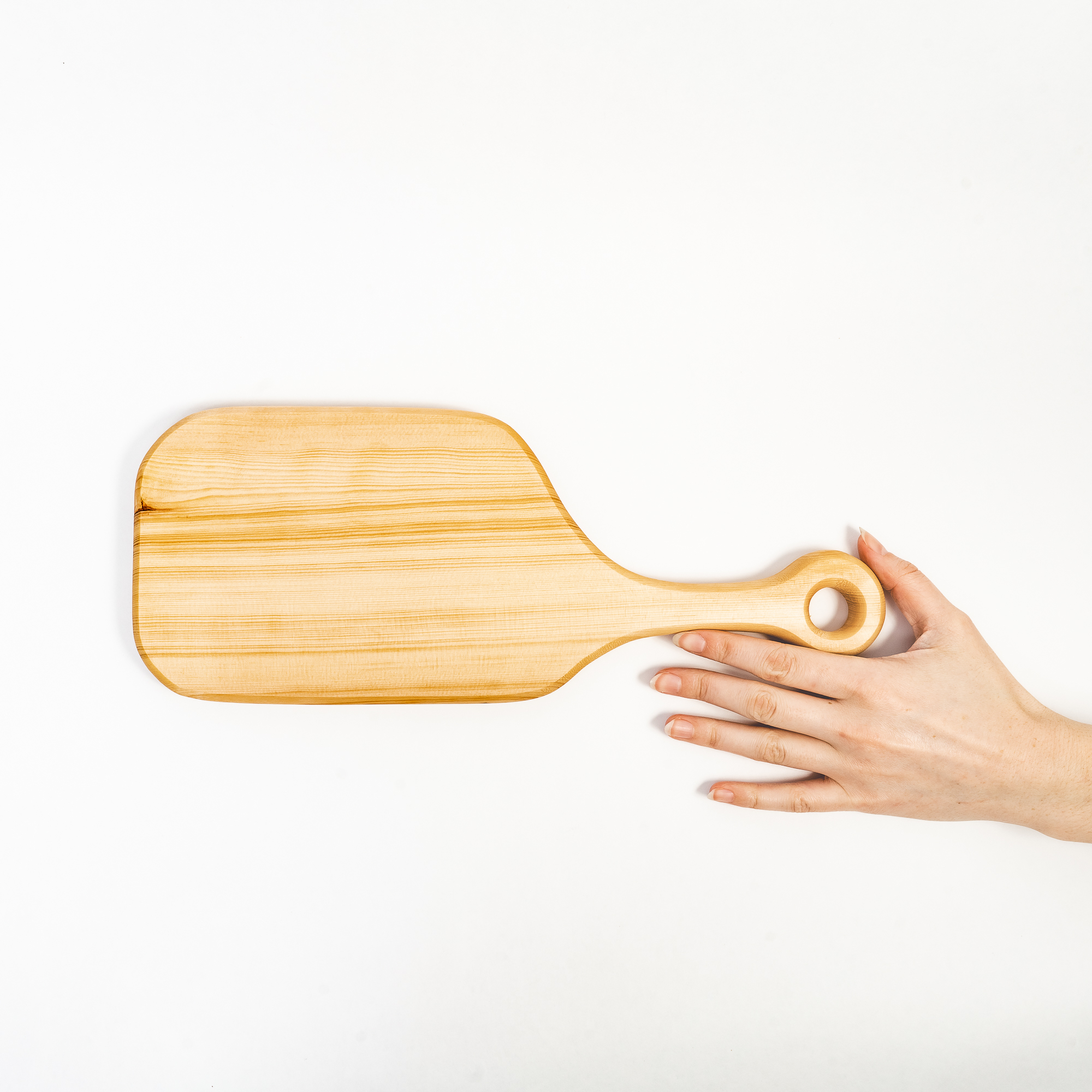 Деревянные доски имеют различную форму со специальным отверстием для крепления на стену. На фото доска разделочная из сибирского кедра.