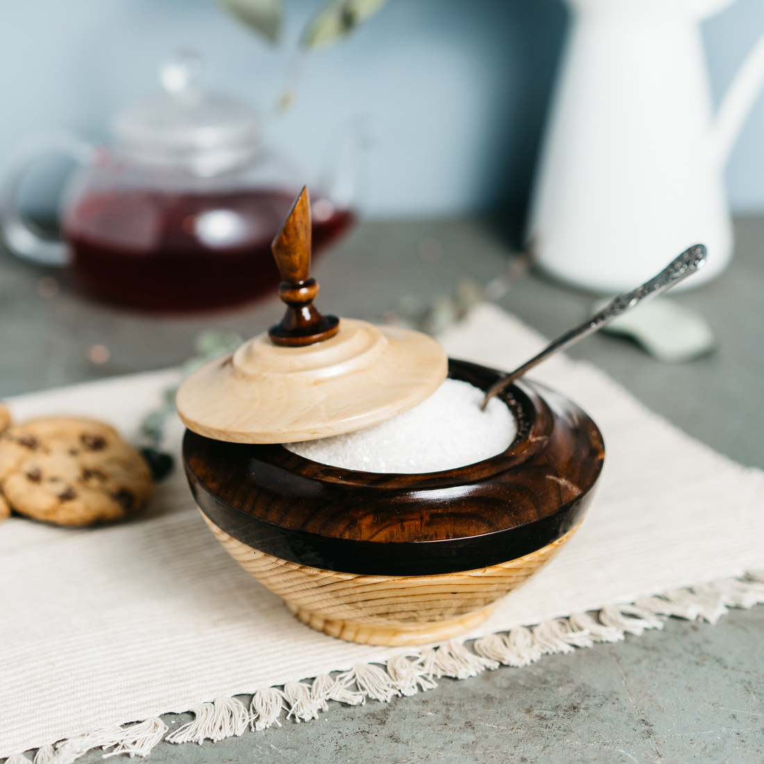 Прекрасно подойдет для сахара, соли, специй, меда и других пищевых продуктов. Снаружи покрыта лаком. Внутри пропитана льняным маслом с пчелиным воском. Безопасна для любых продуктов! Эко посуда! Ручная работа.