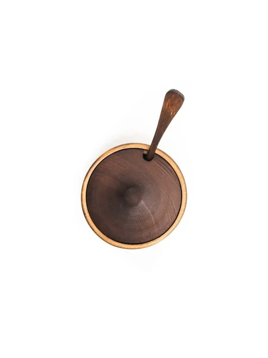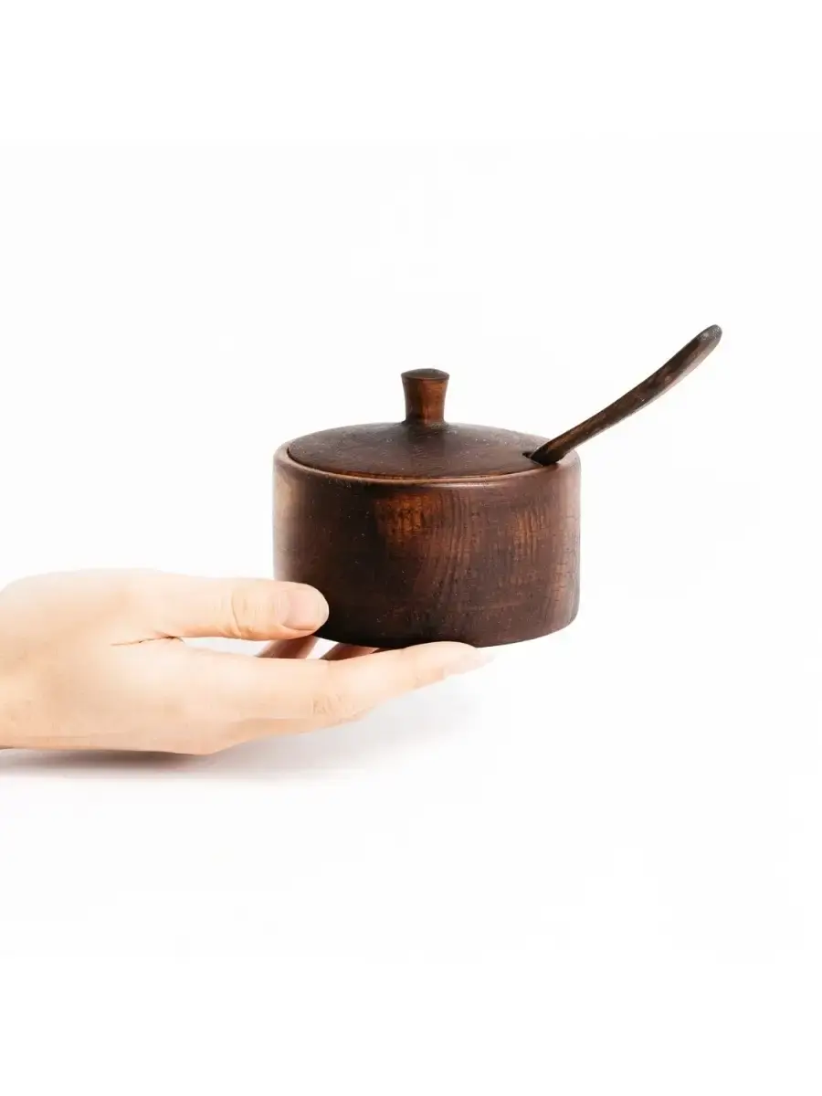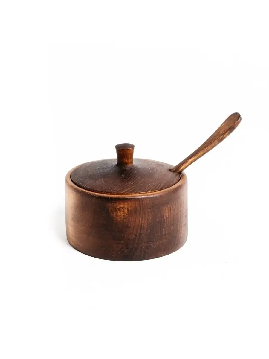 Деревянная сахарница из кедра с ложкой для меда, соли, специй! Прекрасно подойдет для соли, специй, меда и других пищевых продуктов. Еда в посуде из кедра сохраняется дольше, молоко в кедровой кружке не прокисает даже в самый жаркий день, а хлеб никогда не плесневеет. Объяснить это можно тем, что кедр обладает высокими дезинфицирующими свойствами. В деревянной посуде хранят также сливочное масло и мед - считается, что этим продуктам наиболее комфортно в деревянной таре, которая наделяет их дополнительным ароматом. Посуда из кедра способна стать настоящим украшением интерьера кухни, благодаря эстетическим качествам древесины кедра сибирского. Пропитана составом из растительного масла, пчелиного воска, кедровой смолы. Ручная работа. Размер: сахарница - 50 мм.,80 мм - высота сахарницы, накрытой крышкой, диаметр 100 мм, Объём 150 мм. Ложка: длина 135 мм, ширина 30 мм.