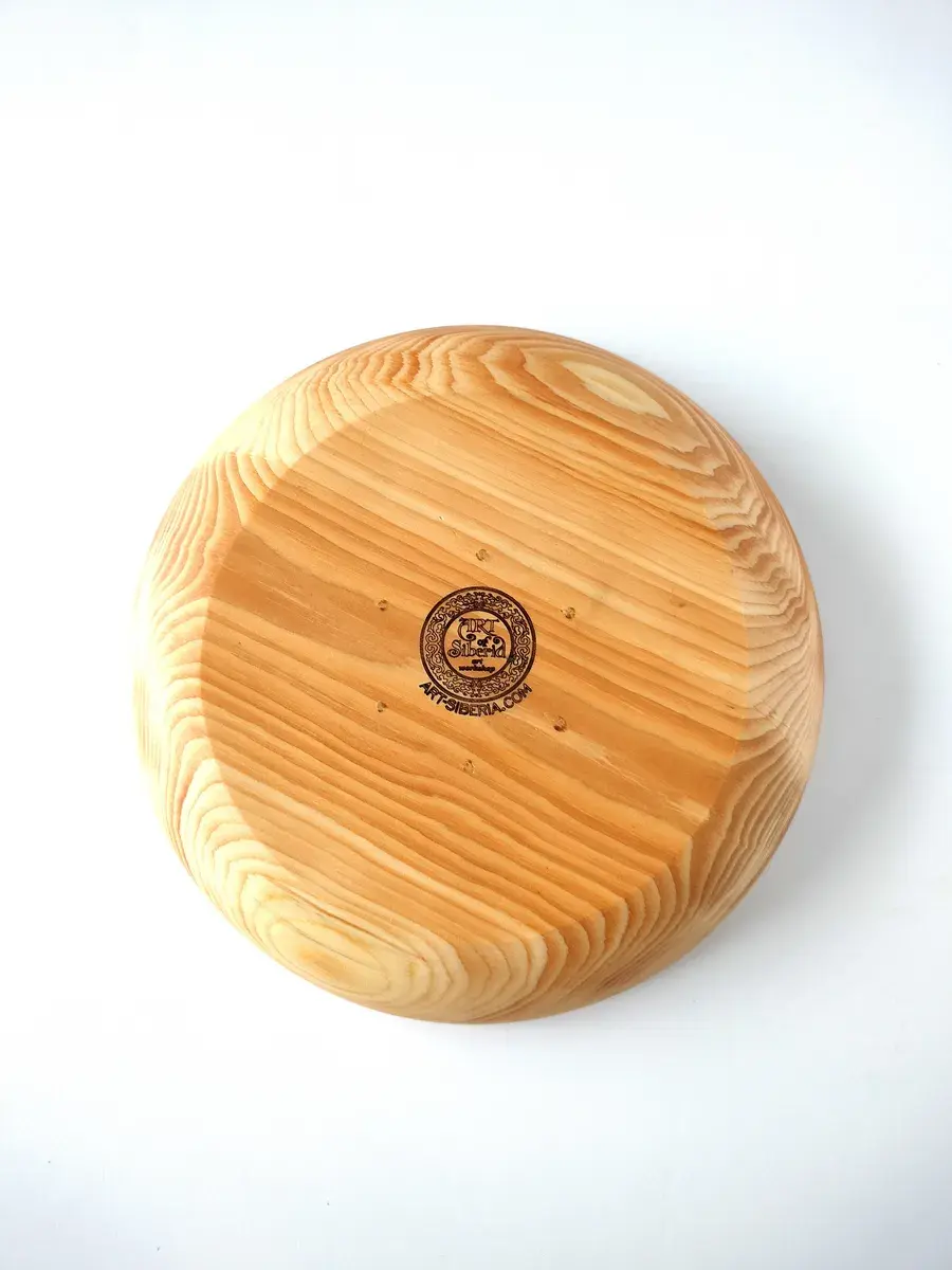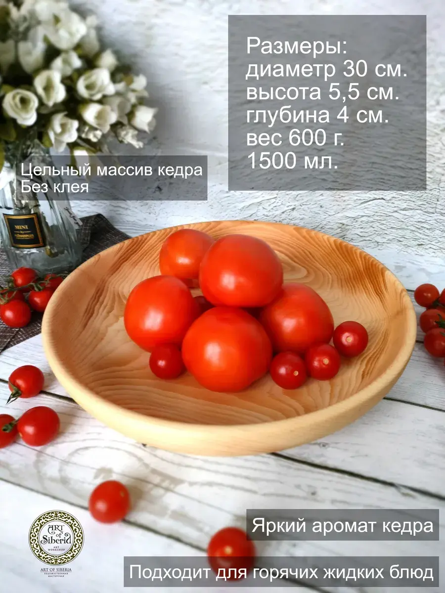 Тарелка из цельного массива сибирского кедра, ручной работы в натуральном цвете! Пропитана нашим составом на основе растительного масла, кедровой смолы и пчелиного воска. Перед использованием обязательно промыть теплой проточной водой, чтоб смыть остаткипокрытия. Изделие может стать чуть светлее. Популярность посуды из кедра объясняется как красотой древесины, так и ее лечебными качествами. Тарелки и миски удобны для приема пищи и для ее хранения. Люди, пользующиеся такими тарелками, могут подтвердить, что еда сохраняет свежесть намного дольше: она не прокиснет и не покроется плесенью. Древесина кедра придаст пище особый аромат и вкус. Размер: Диаметр 30 см., высота 5,5 см., глубина 4 см., вес 650 г., 1500 мл..