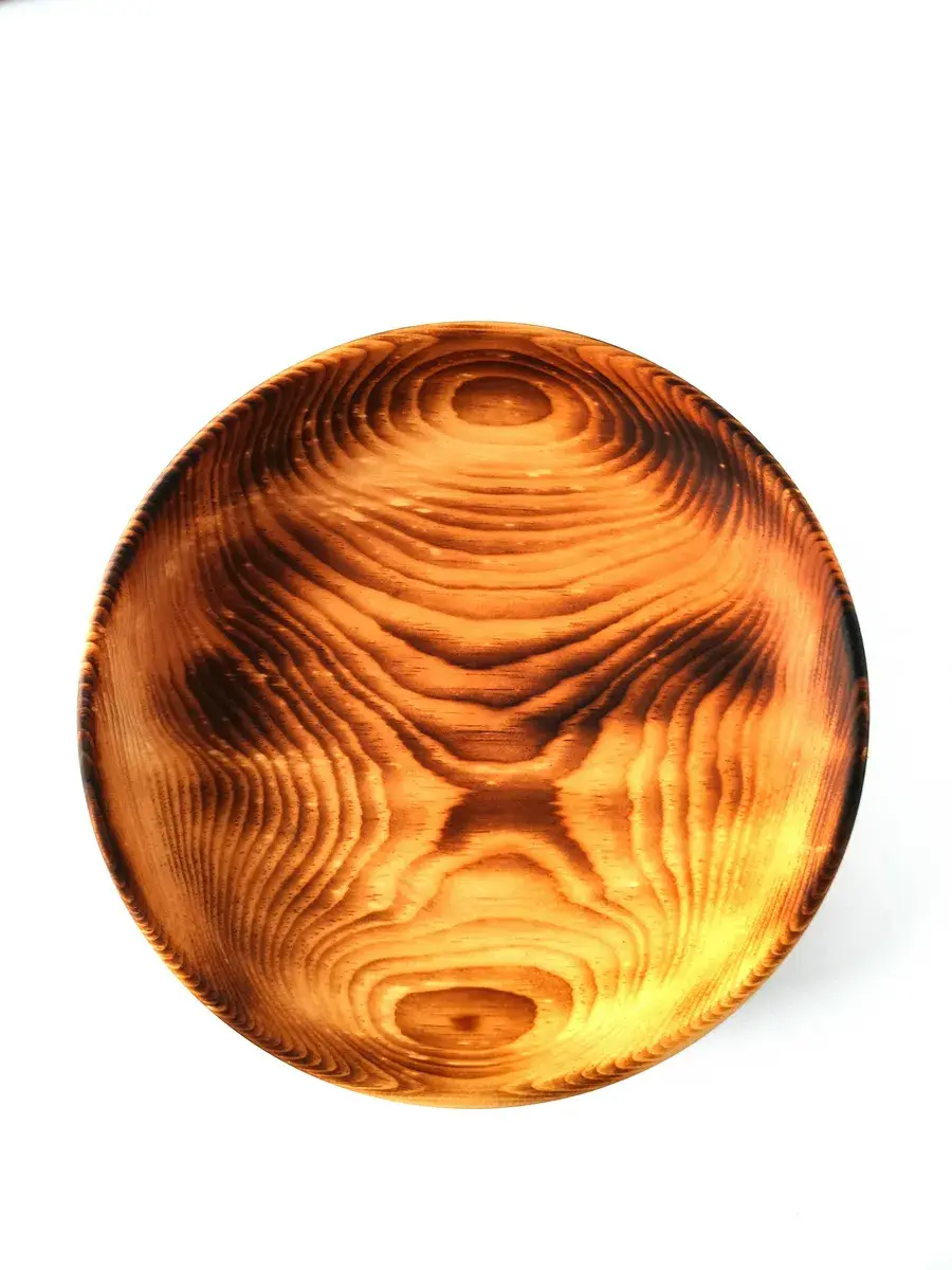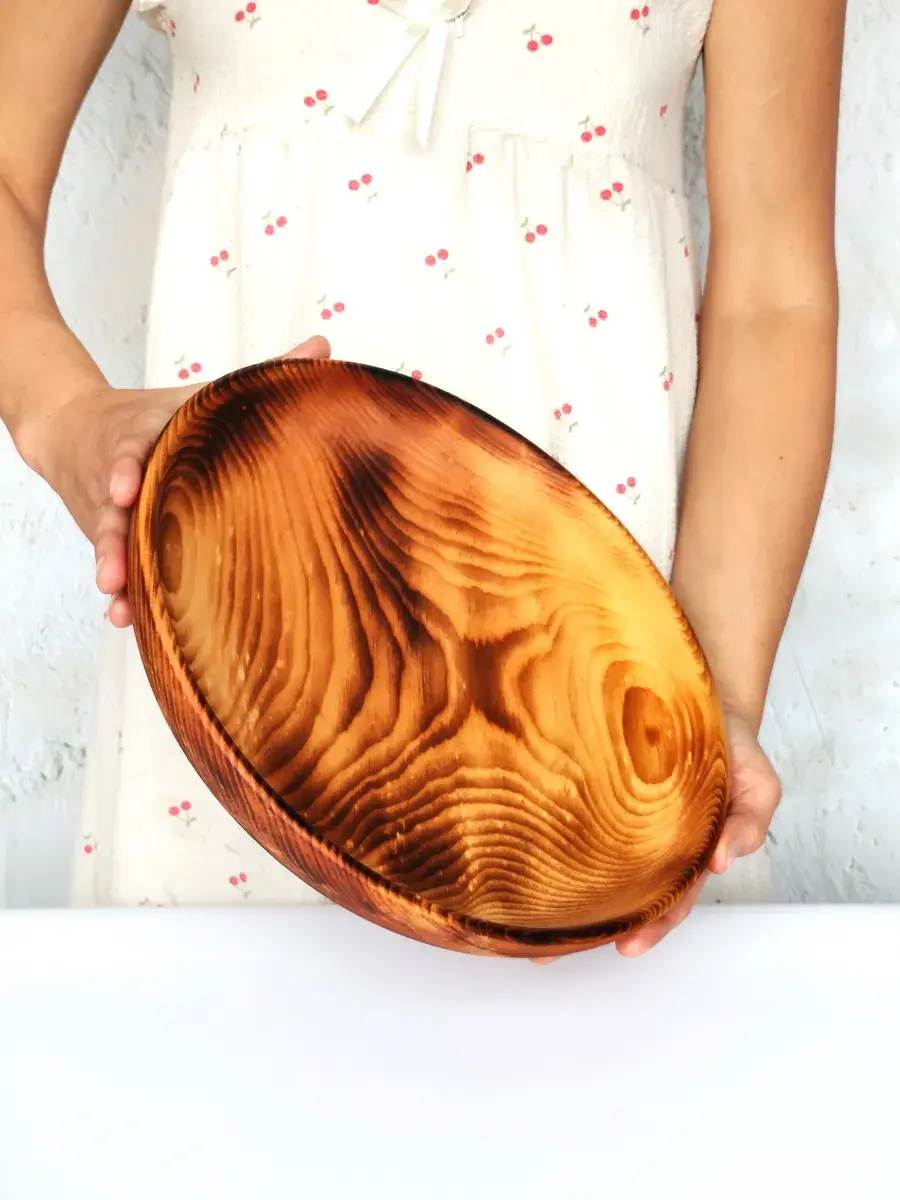 Тарелка из цельного массива сибирского кедра, ручной работы в цвете: обжиг! Пропитана нашим составом на основе растительного масла, кедровой смолы и пчелиного воска. Перед использованием обязательно промыть теплой проточной водой, чтоб смыть остаткипокрытия. Изделие может стать чуть светлее. Популярность посуды из кедра объясняется как красотой древесины, так и ее лечебными качествами. Тарелки и миски удобны для приема пищи и для ее хранения. Люди, пользующиеся такими тарелками, могут подтвердить, что еда сохраняет свежесть намного дольше: она не прокиснет и не покроется плесенью. Древесина кедра придаст пище особый аромат и вкус. Размер: Диаметр 30 см., высота 5,5 см., глубина 4 см., вес 600 г., 1500 мл..