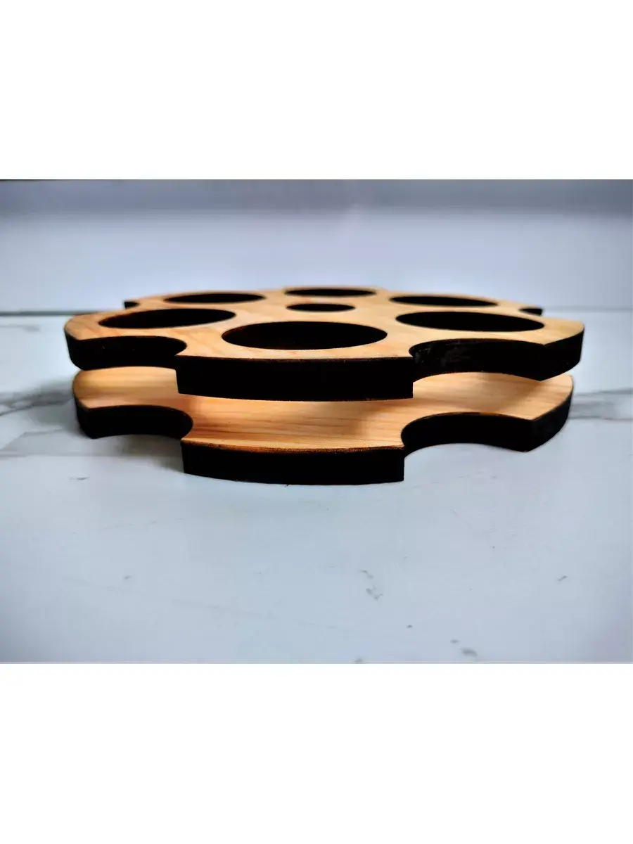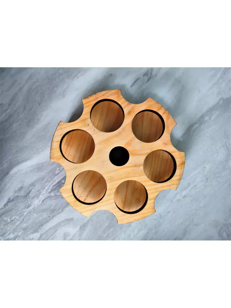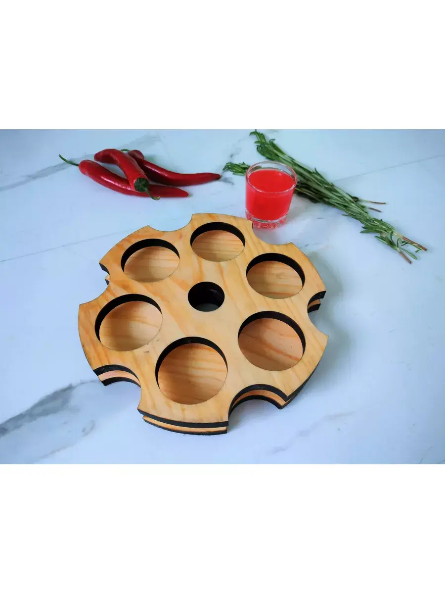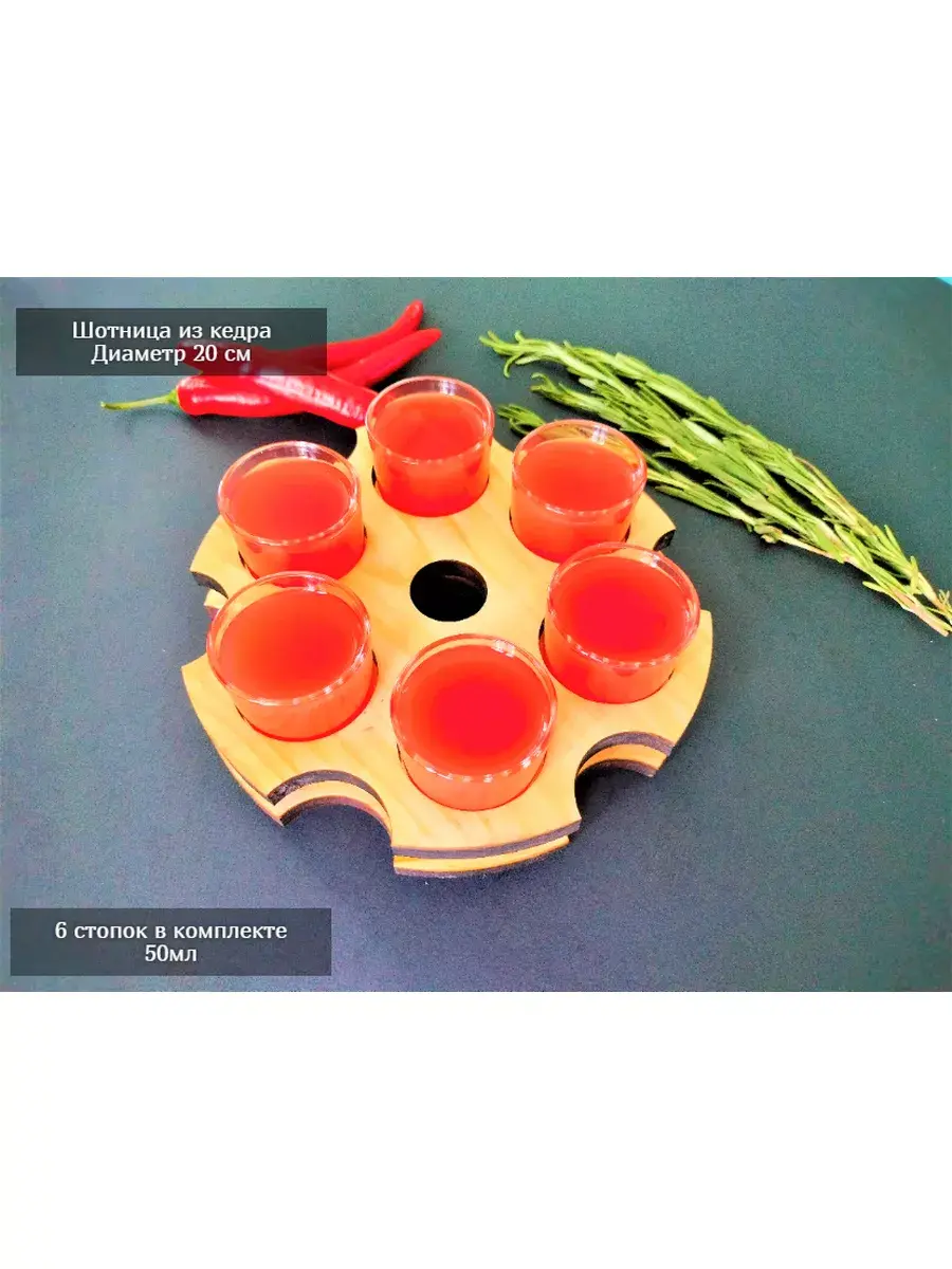 Деревянная шотница в натуральном цвете для подачи с 6 стопками. Стильная и необычная подача напитков точно запомнится Вашим друзьям, коллегам, посетителям и точно способна вызвать восторг. Размер шотницы для крепких напитков: диаметр- 20см, высота-3 см. Стопки объемом 50 мл. Выполнена из массива кедра в стиле LOFT. Ее уникальный дизайн и натуральные материалы создадут атмосферу тепла и комфорта в любом помещении. Не упустите возможность приобрести эту шотницу из массива кедра на 6 стопок и насладиться ее красотой и функциональностью.
