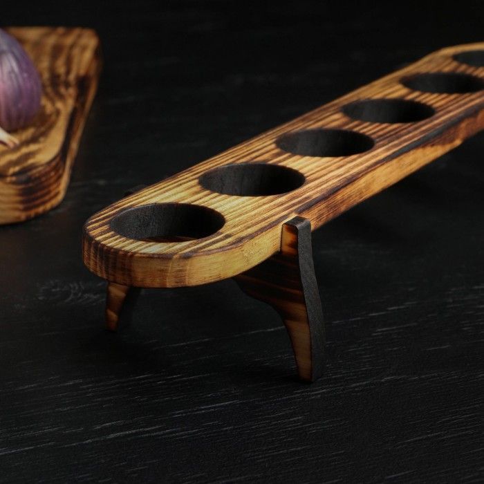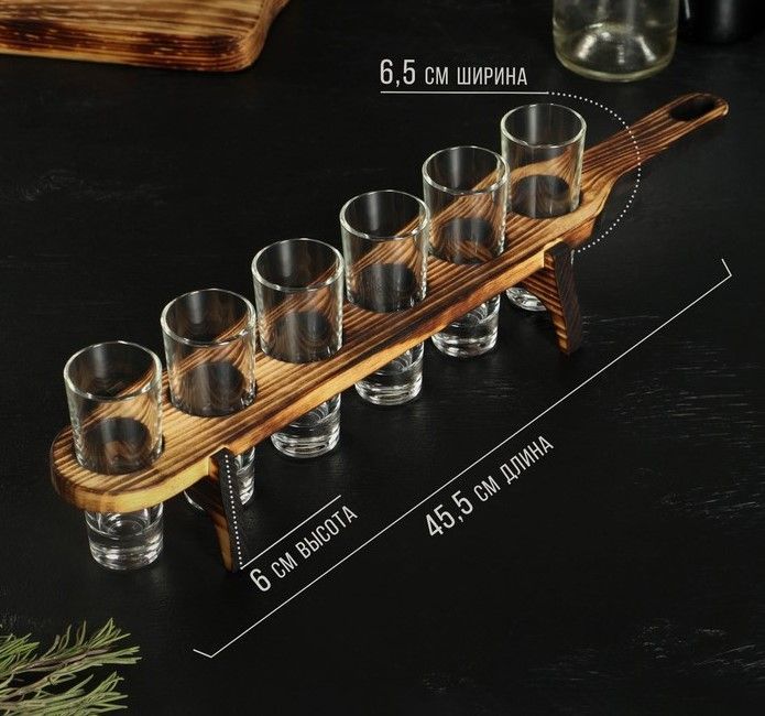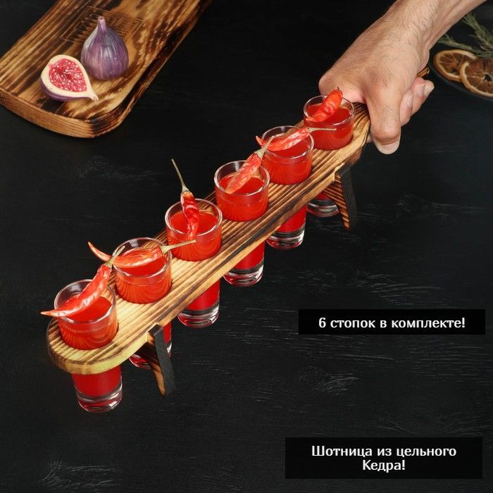 Деревянная шотница в обжиге для подачи с 6 стопоками. Диаметр отверстий: 42мм. Стильная и необычная подача напитков точно запомнится Вашим друзьям, коллегам, посетителям и точно способна вызвать восторг. Размер шотницы для крепких напитков 45,5х6,5х6 см. Стопки объемом 50 мл. Выполнена из массива кедра в стиле LOFT. Доска имеет удобную ручку .Ее уникальный дизайн и натуральные материалы создадут атмосферу тепла и комфорта в любом помещении. Не упустите возможность приобрести эту шотницу из массива кедра на 6 стопок и насладиться ее красотой и функциональностью.