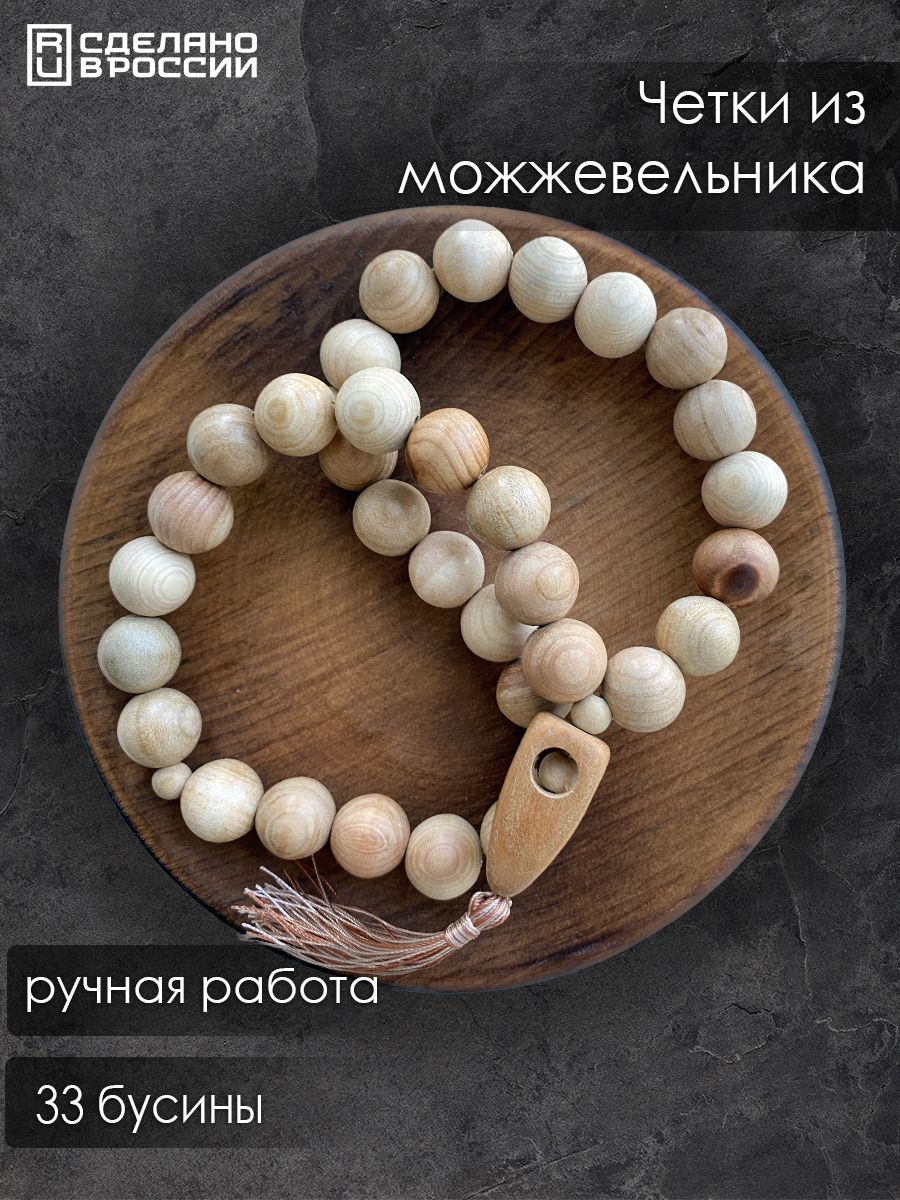 Деревянные четки из древесины можжевельника. Произведены в ручную, состоят из 33 бусин, диаметр 1,5 см. Пересчитывая каждую бусину, человек быстро успокаивается и отстраняется от мирских проблем. Можно использовать в качестве украшение в автомобиль. Имеют приятную текстуру, удобные в использовании. Отличный инструмент для медитации, чтения мант, молитв, и духовной практики. Послужат приятным подарком и мужчине и женщине.