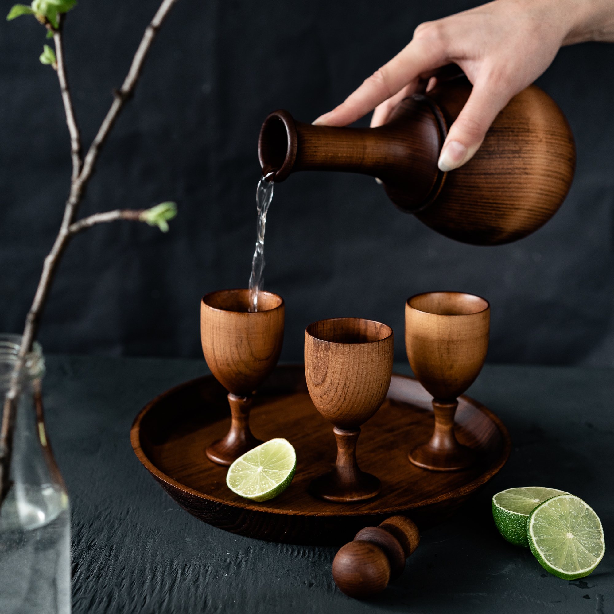 Графины вошли в моду в нашей стране несколько столетий назад, и до сих пор остались актуальными украшениями праздничного стола и интерьера. Графин отличается от кувшина тем, что у него нет носика для наливания и ручки. Он имеет форму, напоминающую бутылку (хотя зачастую с большими вариациями) и обязательно закрывается пробкой. В них может подаваться водка, виски, бренди, а также существуют графины для воды, сока и вина. Для каждого вида напитков используется подходящий графин, в зависимости от вида и крепости содержимого. Мы представляем вам набор - графин с рюмками на подносе, выполнен из дерева сибирского кедра. Графин имеет шаровидную форму с узким горлышком и плотной пробкой, что не дает напиткам выветриться. Такая форма графина позволяет вкусу напитков раскрыться с лучшей стороны, а материал, из которого он изготовлен, придаст дополнительные приятные вкусовые нотки напитку. Графин идет в комплекте с рюмками, к которым также прилагается элегантный поднос. Набор позволяет подать напитки с максимальным изяществом и торжественностью.