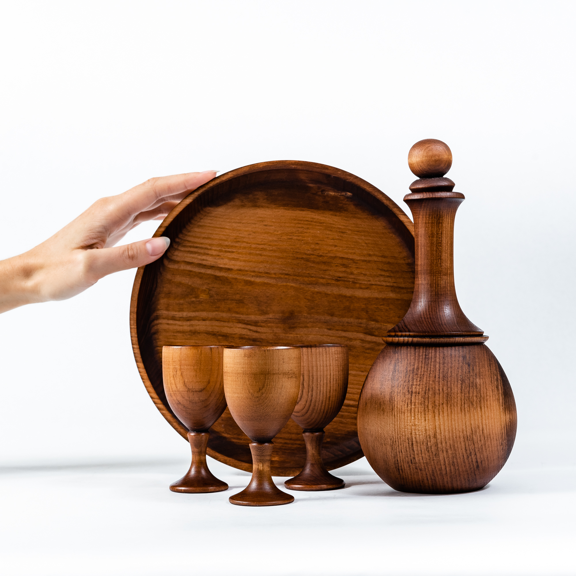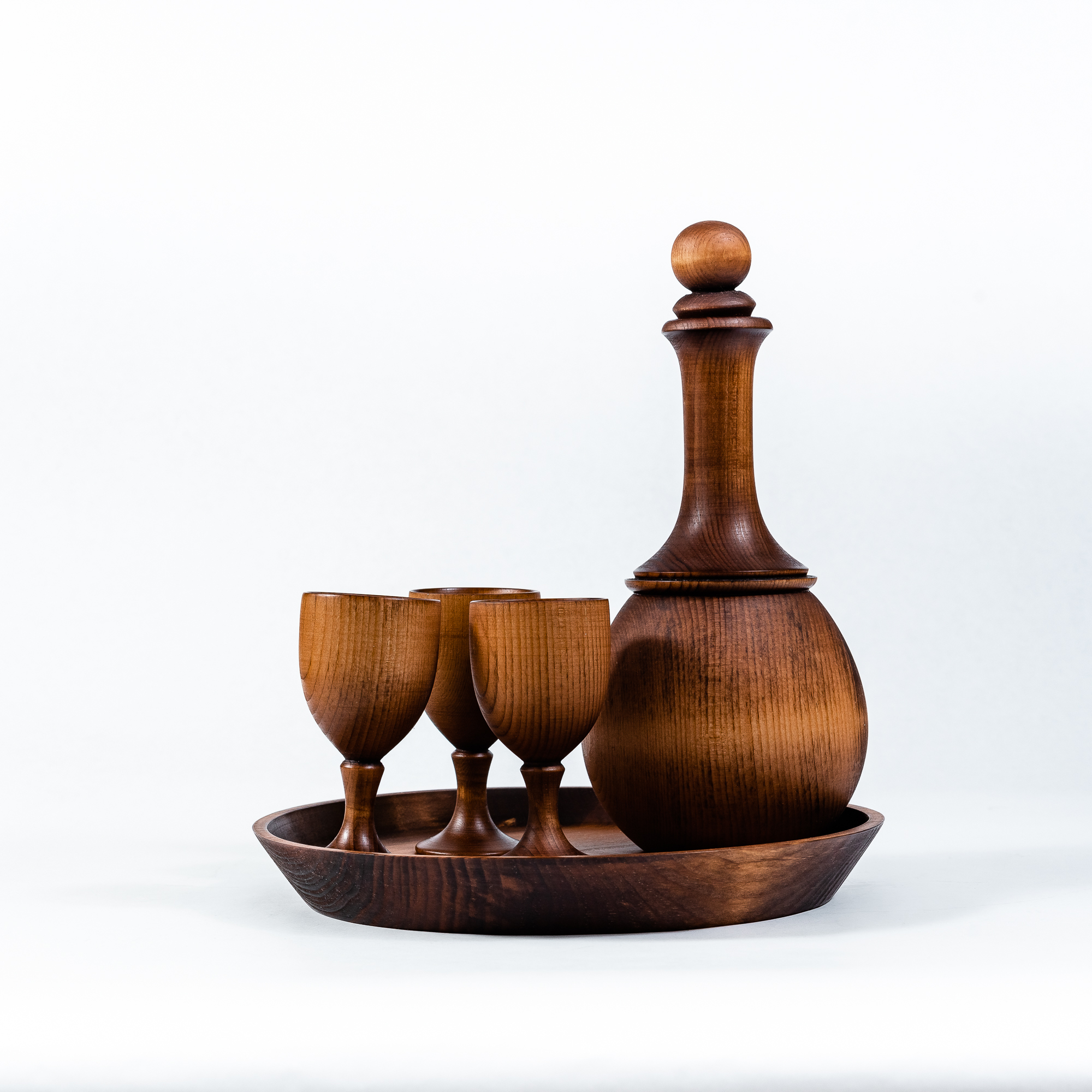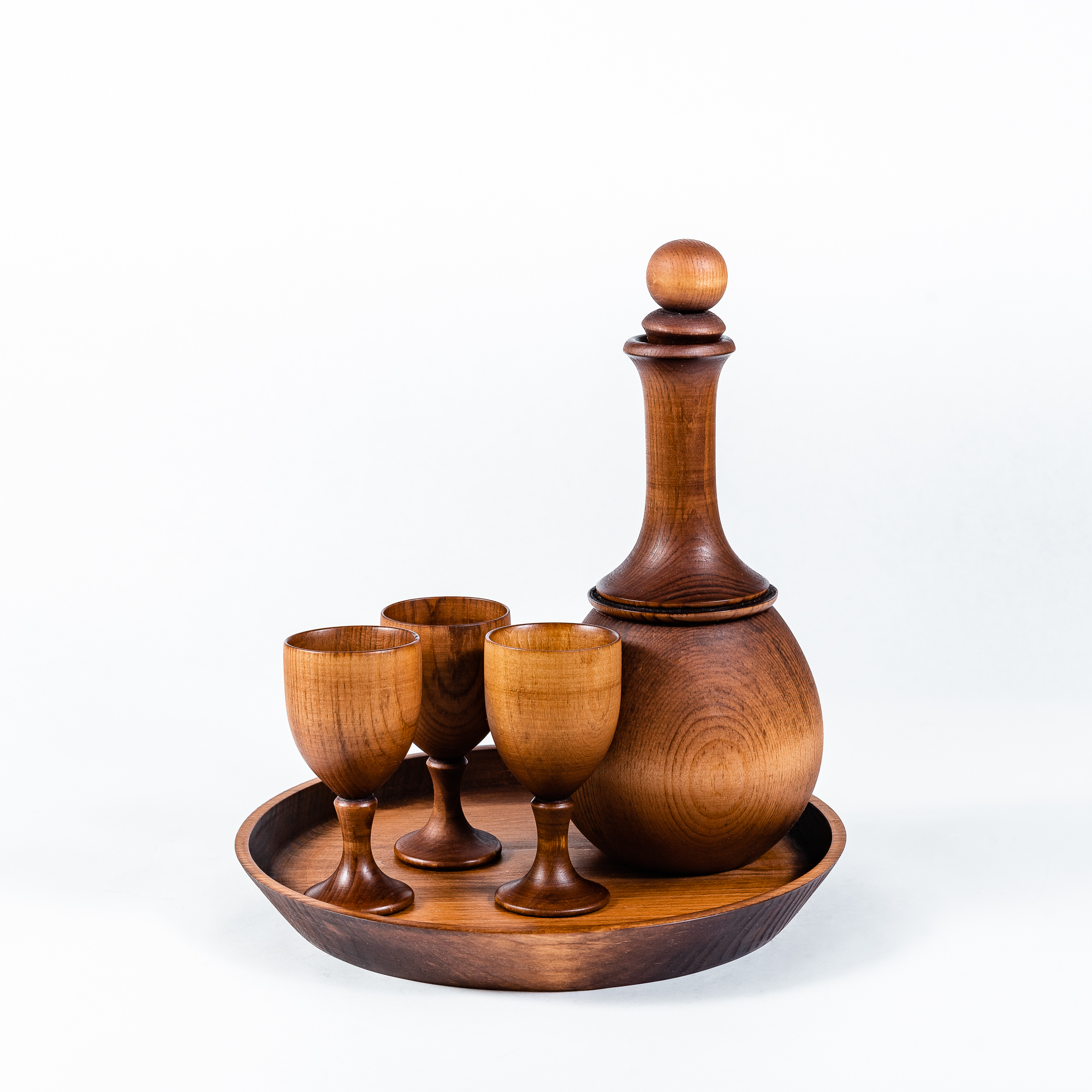Деревянный набор - Графин с тремя рюмками на подносе.