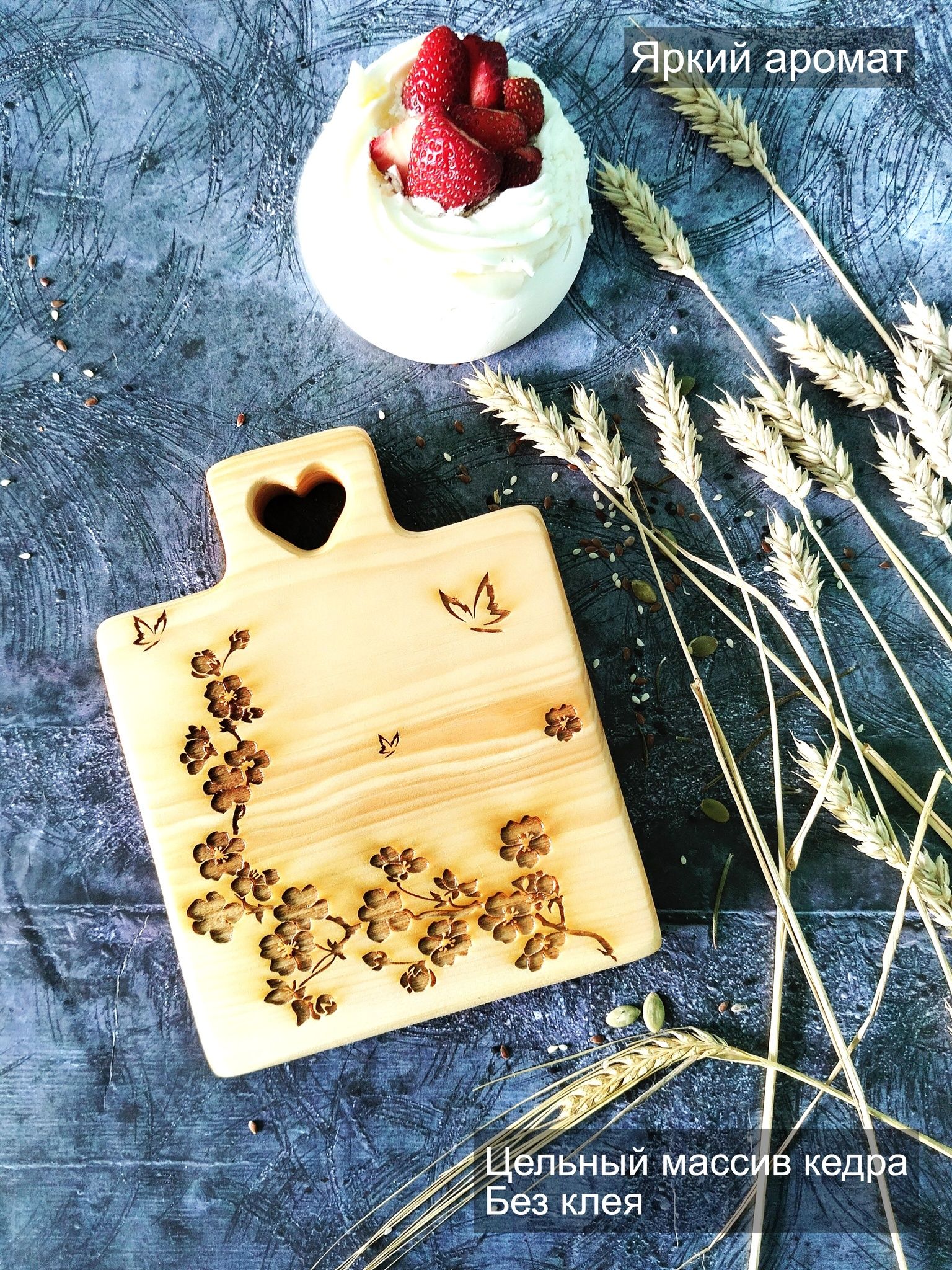Разделочная сервировочная деревянная доска из древесины сибирского кедра. Мы предлагаем вам деревянные разделочные доски, изготовленные из цельного массива Сибирский кедр. Они обладают массой положительных качеств: ножи не тупятся, долговечные, прочные, устойчивы к повреждениям и перепадам температуры, подходят для разделывания больших кусков мяса, а самое главное, а самое главное, кедр обладает антибактериальными свойствами, и бактерии, попадая в волокна доски, не размножаются, а погибают. Ну и, конечно же, частички разделочной доски, попадая в организм человека не причинят вреда. Кроме того, сегодня большой популярностью пользуются сервировочные доски из дерева, на которых не режут, а подают блюда. Чаще всего это хлеб, пироги, пиццы, разные сыры, куски мяса с зеленью и овощами. Разделочную доску можно использовать в качестве подарка. Можно преподнести женщине, маме, любимой девушке, бабушке, жене, подруге, учителю, коллеге, врачу, начальнице, сестре на любой праздник: день рождения, юбилей, новый год, 23 февраля, 8 марта, 1 сентября, 14 февраля, на свадьбу, рождество и новоселье.