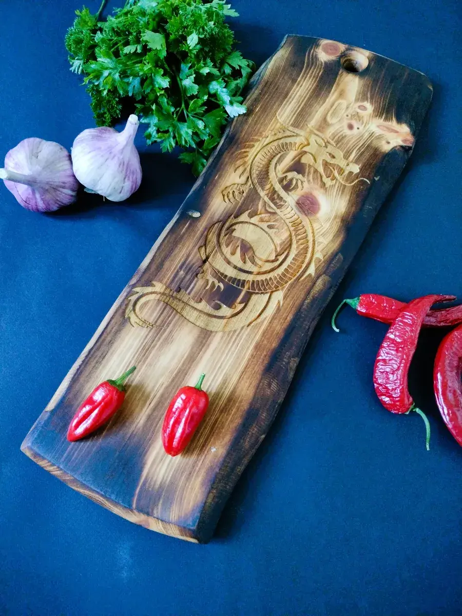 Деревянная разделочная доска из спила древесины сибирского кедра с короедом с гравировкой "Дракон" в обжиге. Есть предметы, без которых не обойтись в домашнем хозяйстве. Разделочная – одна из них. Доска обработана натуральным маслом с пчелиным воском, которое защищает дерево от внешних воздействий. Экологичную разделочную доску можно использовать для: сырого мяса, рыбы, хлеба, овощей и фруктов. Доска обладает массой положительных качеств: ножи не тупятся, доски из кедра долговечные, прочные, устойчивы к повреждениям и перепадам температуры. Подходят для разделывания больших кусков мяса, а самое главное, кедр обладает антибактериальными свойствами, и бактерии, попадая в волокна доски, не размножаются, а погибают. Доска имеет специальное отверстие, которое, пригодится для того, чтобы повесить доску на стену. Доску можно использовать в роли менажницы для подачи и сервировки блюд, она отлично впишется в любой интерьер и будет дополнять его своей уникальностью и стилем. Станет отличным подарком для повара, любителя готовить, близкого человека или просто качественным универсальным подарком. Дорогие покупатели, просим Вас обратить внимание! Каждая деревянная доска из спила имеет уникальную форму и размер, которая может незначительно отличаться от фотографии. Возможно наличие сучков. Не замачивать. Не использовать в посудомоечной машине. После использования тщательно просушивать бумажными полотенцами. Размер: длина от 45 см до 50 см, ширина от 14 см до 19 см, высота-2,5 см.