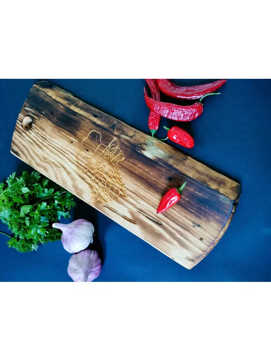 Деревянная разделочная доска из спила древесины сибирского кедра с короедом с гравировкой "Волк" в обжиге. Есть предметы, без которых не обойтись в домашнем хозяйстве. Разделочная – одна из них. Доска обработана натуральным маслом с пчелиным воском, которое защищает дерево от внешних воздействий. Экологичную разделочную доску можно использовать для: сырого мяса, рыбы, хлеба, овощей и фруктов. Доска обладает массой положительных качеств: ножи не тупятся, доски из кедра долговечные, прочные, устойчивы к повреждениям и перепадам температуры. Подходят для разделывания больших кусков мяса, а самое главное, кедр обладает антибактериальными свойствами, и бактерии, попадая в волокна доски, не размножаются, а погибают. Доска имеет специальное отверстие, которое, пригодится для того, чтобы повесить доску на стену. Доску можно использовать в роли менажницы для подачи и сервировки блюд, она отлично впишется в любой интерьер и будет дополнять его своей уникальностью и стилем. Станет отличным подарком для повара, любителя готовить, близкого человека или просто качественным универсальным подарком. Дорогие покупатели, просим Вас обратить внимание! Каждая деревянная доска из спила имеет уникальную форму и размер, которая может незначительно отличаться от фотографии. Возможно наличие сучков. Не замачивать. Не использовать в посудомоечной машине. После использования тщательно просушивать бумажными полотенцами. Размер: длина от 45 см до 50 см, ширина от 14 см до 19 см, высота-2,5 см.