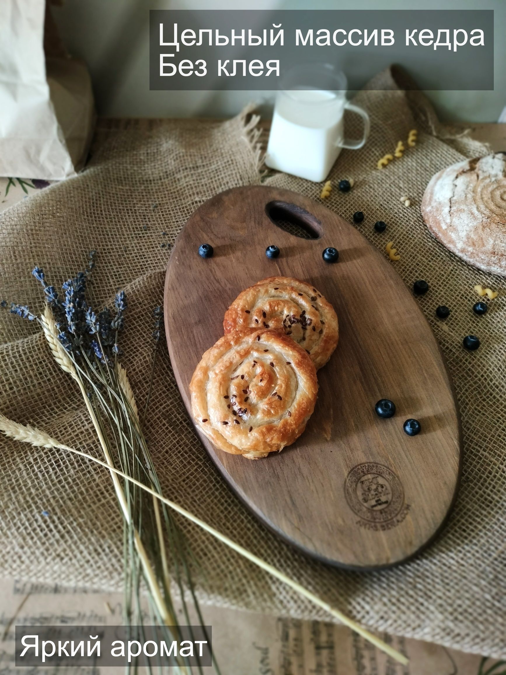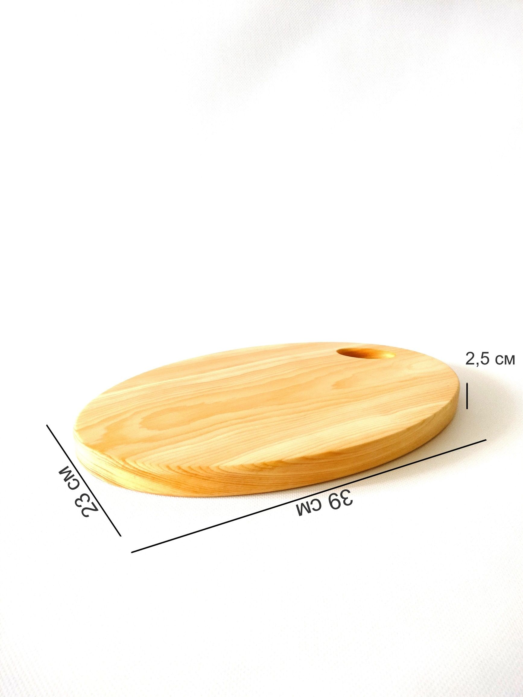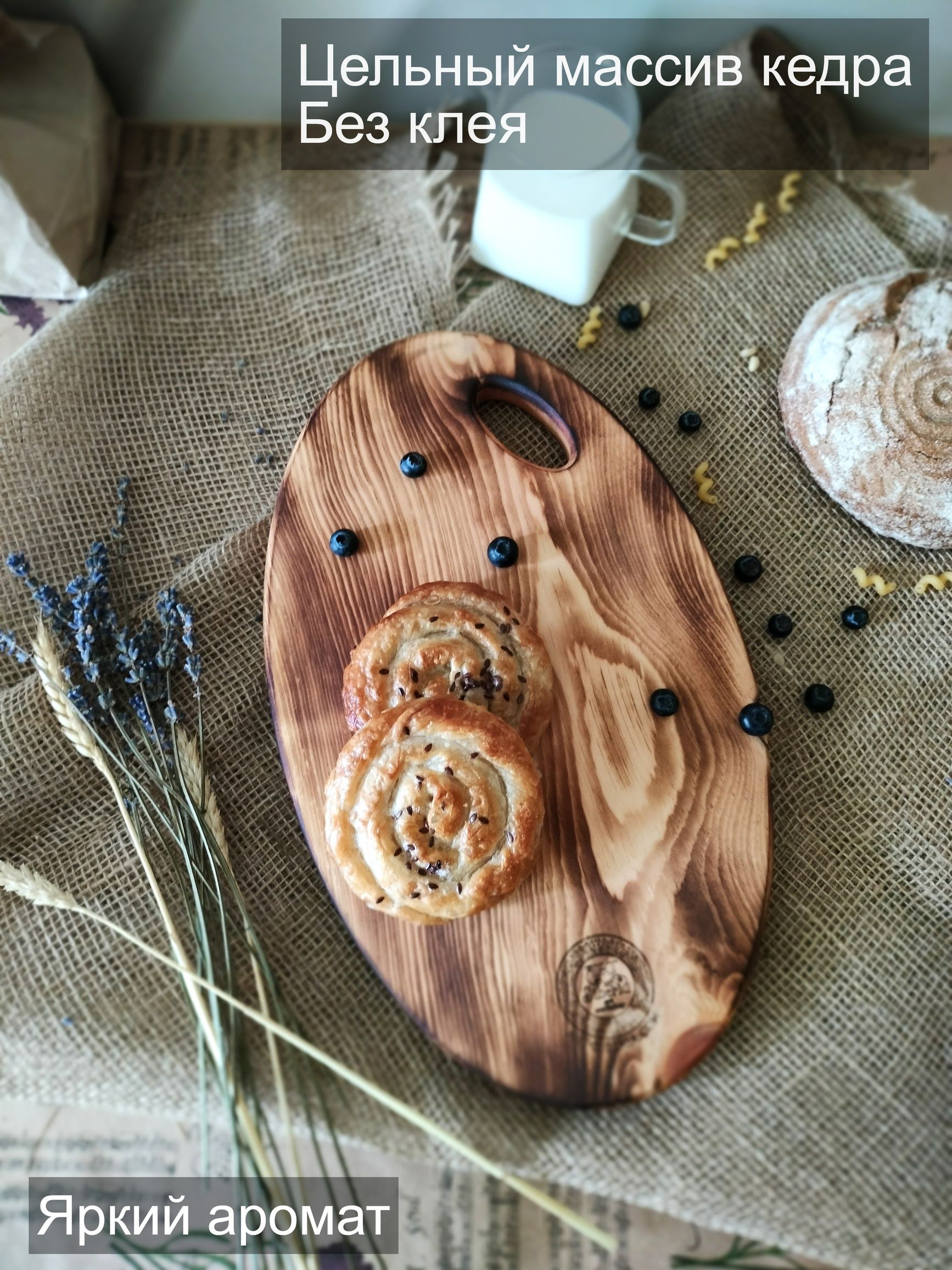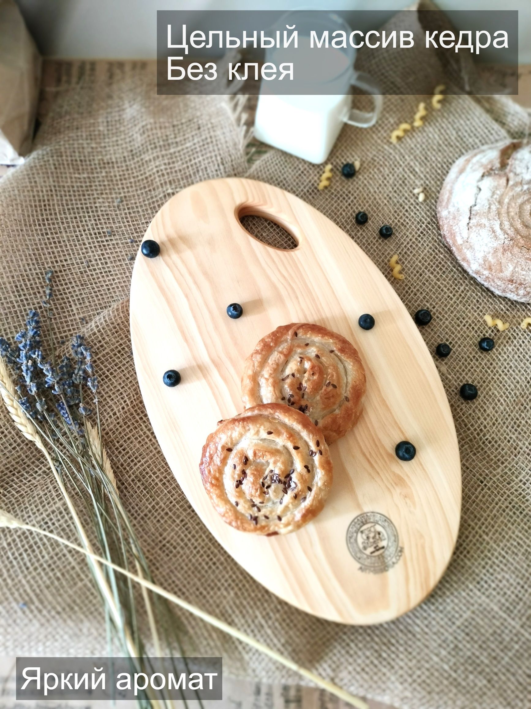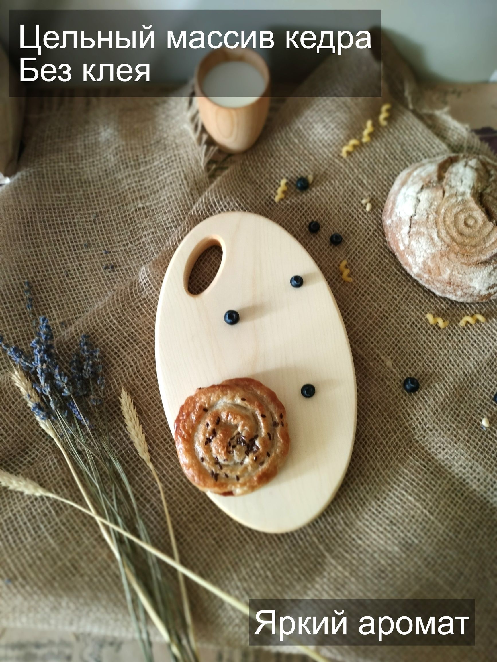 Деревянная разделочная доска из спила древесины сибирского кедра. Есть предметы, без которых не обойтись в домашнем хозяйстве. Разделочная – одна из них. Доска обработана натуральным маслом с пчелиным воском, которое защищает дерево от внешних воздействий. Экологичную разделочную доску можно использовать для: сырого мяса, рыбы, хлеба, овощей и фруктов. Доска обладает массой положительных качеств: ножи не тупятся, доски из кедра долговечные, прочные, устойчивы к повреждениям и перепадам температуры. Подходят для разделывания больших кусков мяса, а самое главное, кедр обладает антибактериальными свойствами, и бактерии, попадая в волокна доски, не размножаются, а погибают. Доска имеет специальное отверстие, которое, пригодится для того, чтобы повесить доску на стену. Доску можно использовать в роли менажницы для подачи и сервировки блюд, она отлично впишется в любой интерьер и будет дополнять его своей уникальностью и стилем. Станет отличным подарком для повара, любителя готовить, близкого человека или просто качественным универсальным подарком. Дорогие покупатели, просим Вас обратить внимание! Каждая деревянная доска из спила имеет уникальную форму, которая может незначительно отличаться от фотографии. Возможно наличие сучков. Не замачивать. Не использовать в посудомоечной машине. После использования тщательно просушивать бумажными полотенцами.