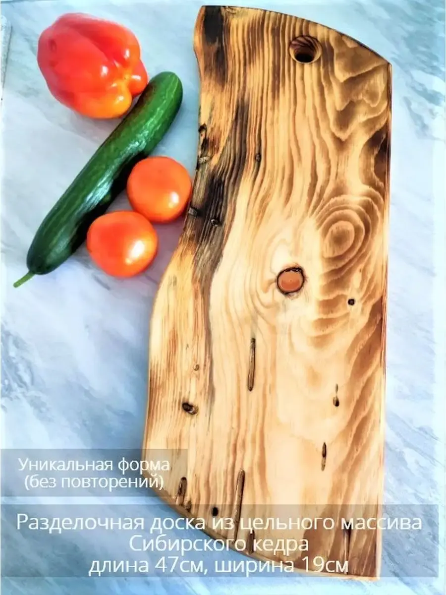 Деревянная разделочная доска из спила древесины сибирского кедра с короедом. Есть предметы, без которых не обойтись в домашнем хозяйстве. Разделочная – одна из них. Доска обработана натуральным маслом с пчелиным воском, которое защищает дерево от внешних воздействий. Экологичную разделочную доску можно использовать для: сырого мяса, рыбы, хлеба, овощей и фруктов. Доска обладает массой положительных качеств: ножи не тупятся, доски из кедра долговечные, прочные, устойчивы к повреждениям и перепадам температуры. Подходят для разделывания больших кусков мяса, а самое главное, кедр обладает антибактериальными свойствами, и бактерии, попадая в волокна доски, не размножаются, а погибают. Доска имеет специальное отверстие, которое, пригодится для того, чтобы повесить доску на стену. Доску можно использовать в роли менажницы для подачи и сервировки блюд, она отлично впишется в любой интерьер и будет дополнять его своей уникальностью и стилем. Станет отличным подарком для повара, любителя готовить, близкого человека или просто качественным универсальным подарком. Дорогие покупатели, просим Вас обратить внимание! Каждая деревянная доска из спила имеет уникальную форму и размер, которая может незначительно отличаться от фотографии. Возможно наличие сучков. Не замачивать. Не использовать в посудомоечной машине. После использования тщательно просушивать бумажными полотенцами.