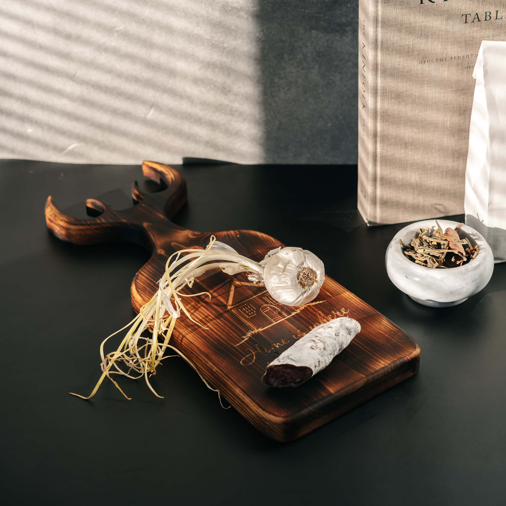 Доска разделочная из древесины сибирского кедра с гравировкой "Home is where the heart is".