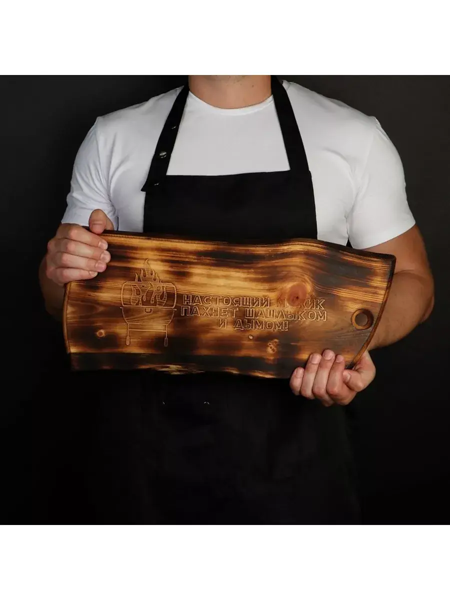 Деревянная разделочная доска из спила древесины сибирского кедра с короедом с гравировкой: "НАСТОЯЩИЙ МУЖИК, ПАХНЕТ ШАШЛЫКОМ И ДЫМОМ". Есть предметы, без которых не обойтись в домашнем хозяйстве. Разделочная – одна из них. Доска обработана натуральным маслом с пчелиным воском, которое защищает дерево от внешних воздействий. Экологичную разделочную доску можно использовать для: сырого мяса, рыбы, хлеба, овощей и фруктов. Доска обладает массой положительных качеств: ножи не тупятся, доски из кедра долговечные, прочные, устойчивы к повреждениям и перепадам температуры. Подходят для разделывания больших кусков мяса, а самое главное, кедр обладает антибактериальными свойствами, и бактерии, попадая в волокна доски, не размножаются, а погибают. Доска имеет специальное отверстие, которое, пригодится для того, чтобы повесить доску на стену. Доску можно использовать в роли менажницы для подачи и сервировки блюд, она отлично впишется в любой интерьер и будет дополнять его своей уникальностью и стилем. Станет отличным подарком для повара, любителя готовить, близкого человека или просто качественным универсальным подарком. Дорогие покупатели, просим Вас обратить внимание! Каждая деревянная доска из спила имеет уникальную форму и размер, которая может незначительно отличаться от фотографии. Возможно наличие сучков. Не замачивать. Не использовать в посудомоечной машине. После использования тщательно просушивать бумажными полотенцами. Цвет-"обжиг".