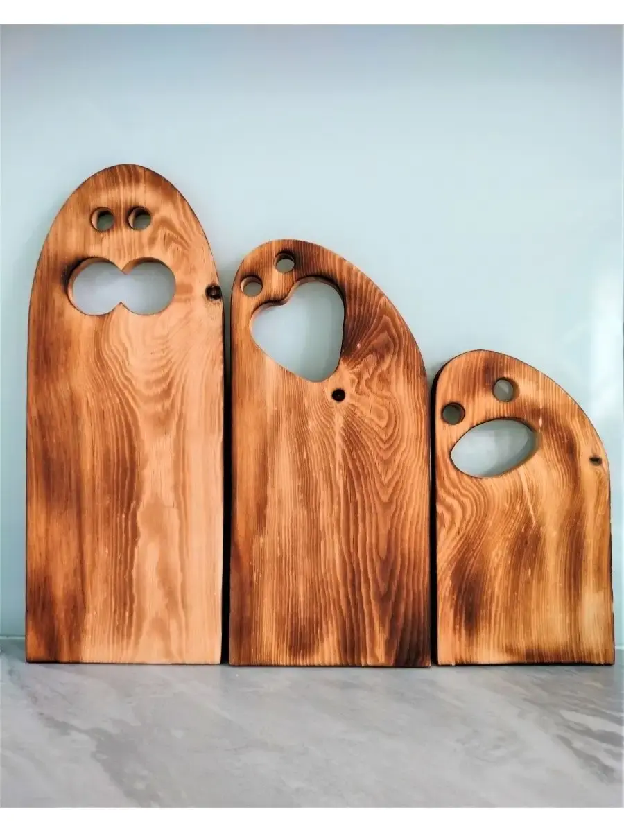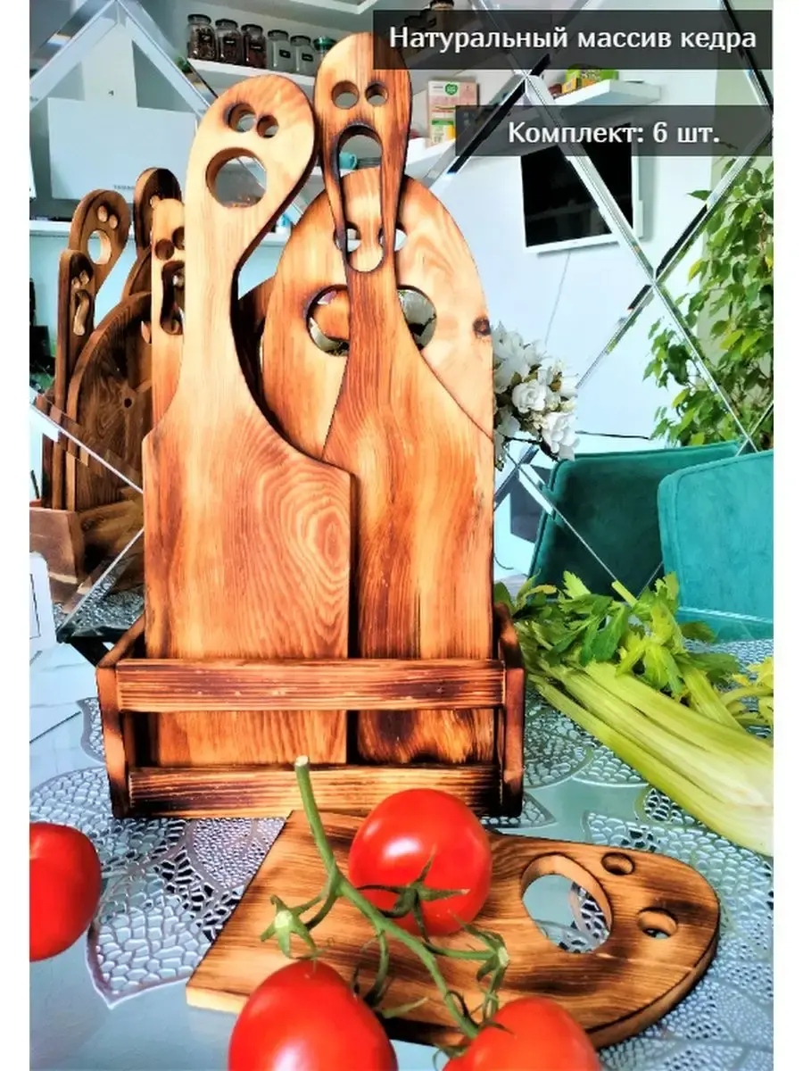 Разделочные/ сервировочные доски из сибирского кедра 6 шт. в ящике. Цвет -"обжиг". Разделочная доска - совершенно необходимый предмет на каждой кухне. Но одной разделочной доски далеко не всегда достаточно для того, чтобы процесс готовки был удобным. Предлагаем вам нашу новинку - набор разделочных досок из массива сибирского кедра! Они достаточно мягкие, чтобы не тупить нож при использовании и наиболее универсальны. Дерево придает интерьеру кухни дополнительный уют, то есть такую разделочную доску можно рассматривать не только в качестве инструмента, но и как аксессуар. Размер досок: 1. 380х105x25 мм., 2. 450х140х15 мм., 3. 340х160х15 мм., 4. 400x160x15 мм., 5. 250x140x15 мм., 6.480x120x15 мм. Короб: 260x110x10 мм..