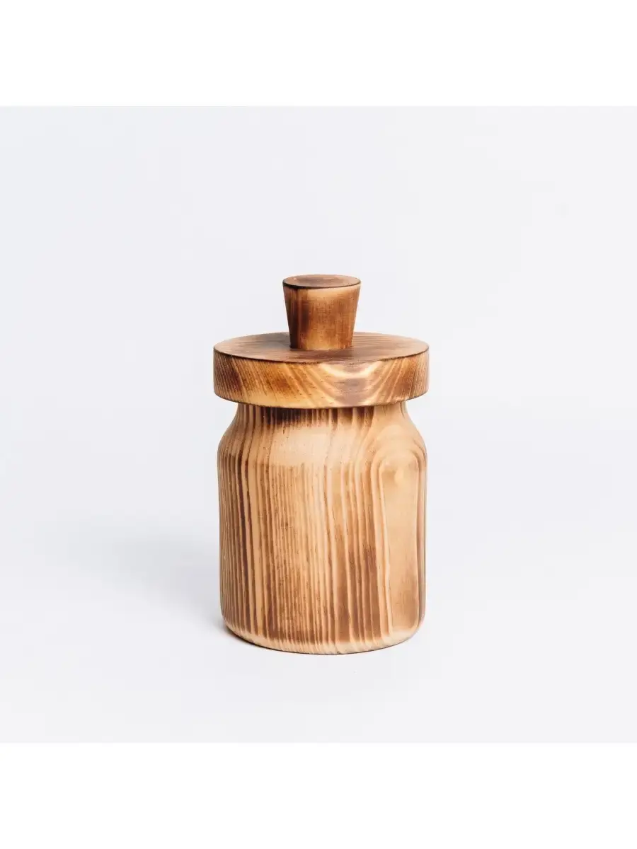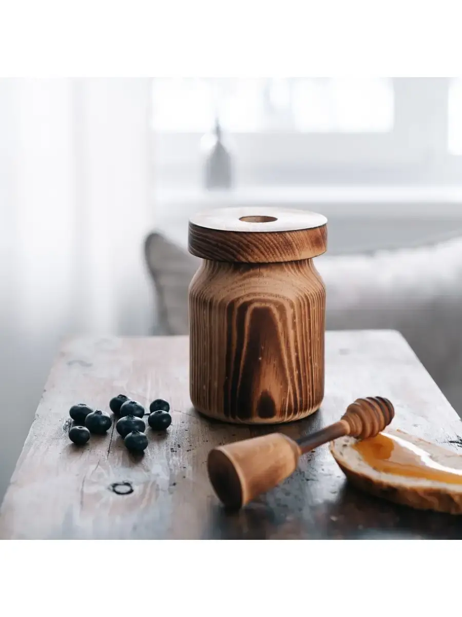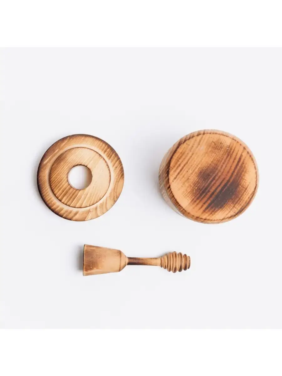 Деревянная чашка (бочонок) для мёда с крышкой и ложечкой для меда из древесины кедра. Маленькая кубышка в виде бочонка из массива натурального сибирского Кедра. Для соли, специй, меда или других пищевых продуктов. Снаружи и внутри пропитана горячим растительным маслом с пчелиным воском. Лучше всего для хранения меда подходит посуда, изготовленная из древесины. Дерево придает меду ненавязчивые, очень приятные вкусовые оттенки, гармонично сочетающиеся с его в ароматом. Высокая плотность древесины, хорошо защищает мед от внешних воздействий. Также идеально подходит для варенья, конфет, орехов, сахара. Хороша для хранения трав.