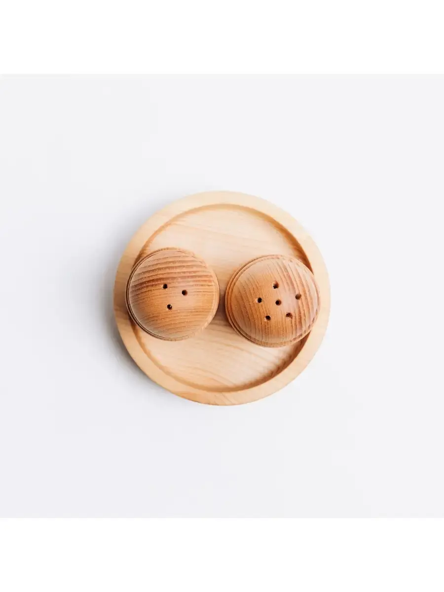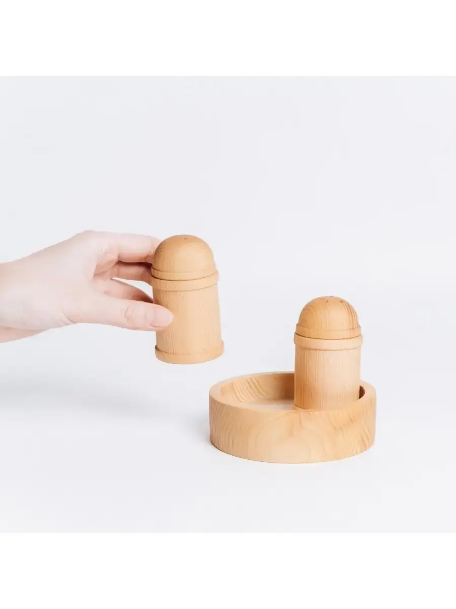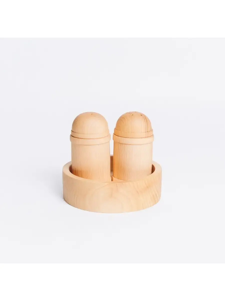 Деревянная солонка и перечница с подставкой из сибирского кедра. Необходимый атрибут любой трапезы и украшение обеденного стола! Меняйте вкус любимых блюд на Ваше усмотрение, наслаждайтесь уникальным природным узором натурального дерева! Для всей семьи! Пропитана нашим составом на основе растительного масла, кедровой смолы и пчелиного воска. Перед использованием обязательно промыть теплой проточной водой, чтоб смыть остатки масла. **Размер:** Подставка: диаметр 11 см, высота 3.3 см. Солонка/перечница: высота 8 см, диаметр 4.5 см.