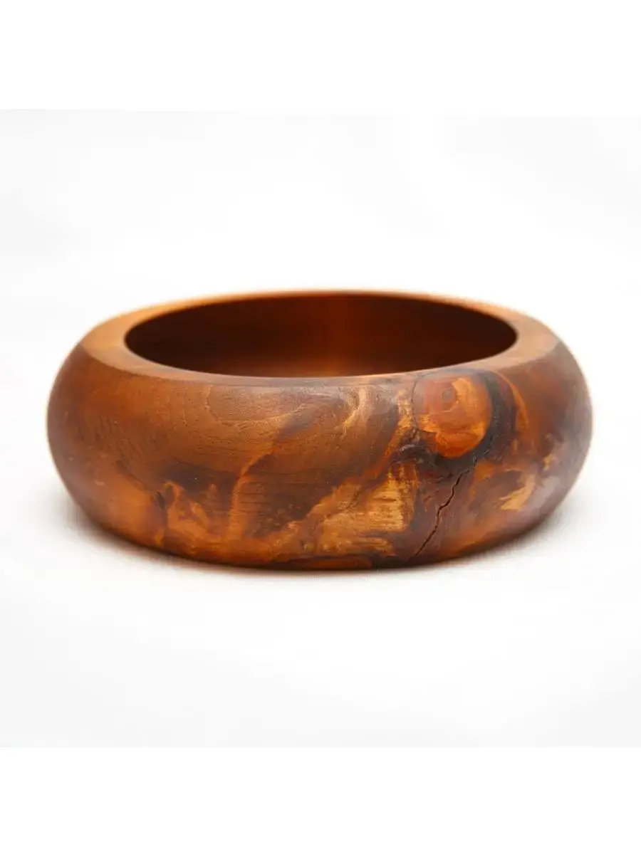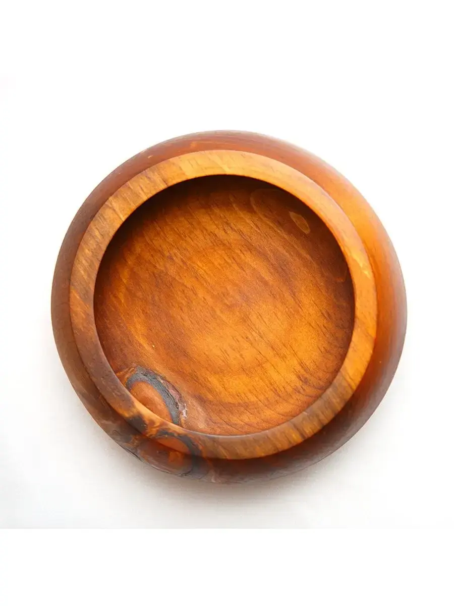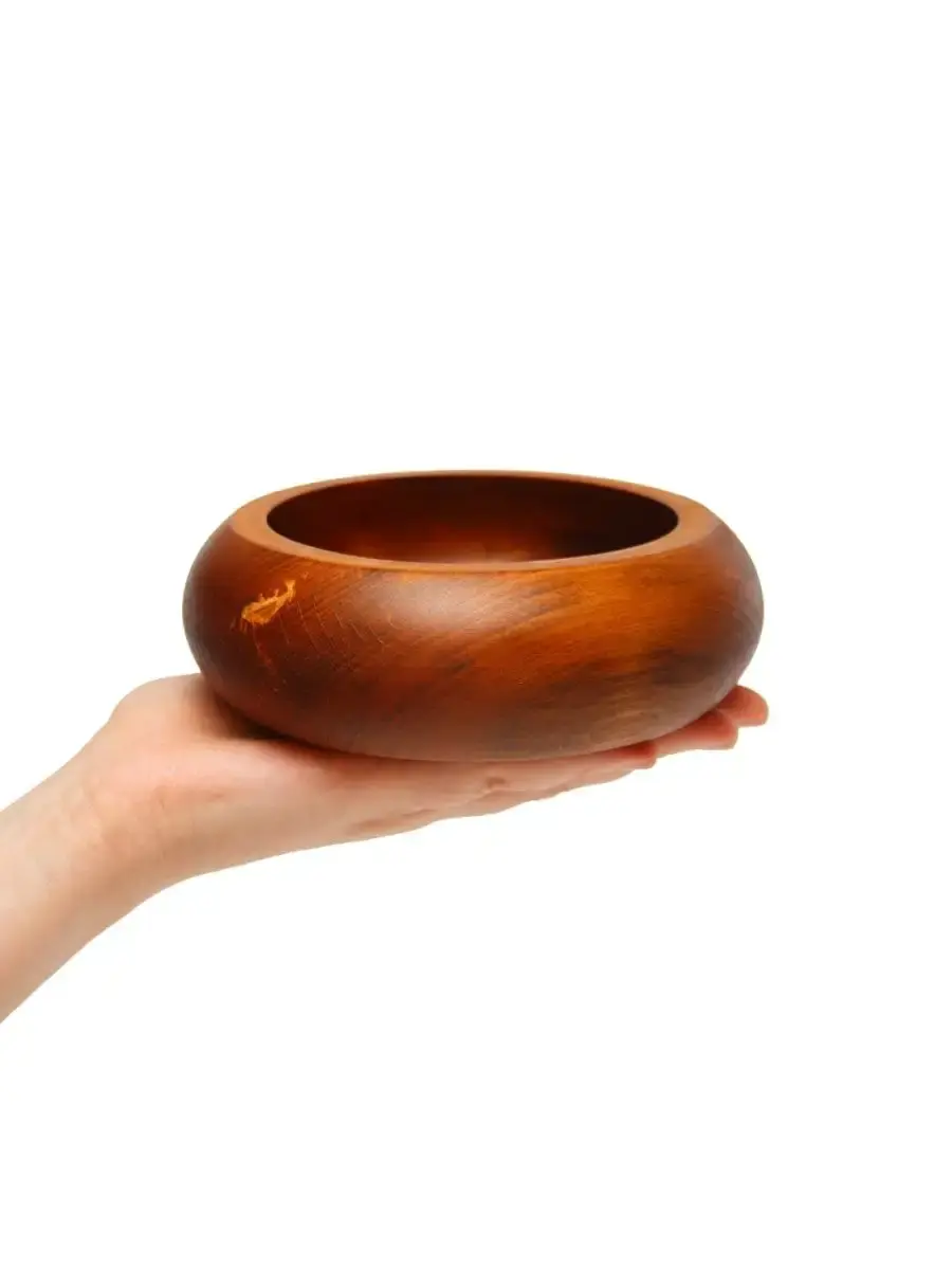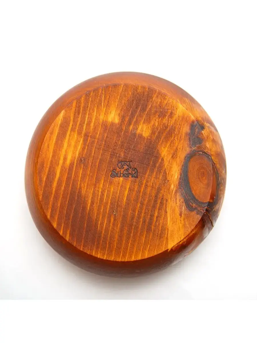 Глубокая тарелка из цельного куска дерева. Популярность посуды из кедра объясняется как красотой древесины, так и ее лечебными качествами. Тарелки и миски удобны для приема пищи и для ее хранения. Люди, пользующиеся такими тарелками, могут подтвердить, что еда сохраняет свежесть намного дольше: она не прокиснет и не покроется плесенью. Древесина кедра придаст пище особый аромат и вкус. И что немаловажно, кедр обладает дезинфицирующим свойством, и продукты в такой тарелке становятся полезней, насыщаясь фитонцидами кедра. Покрыта для придания цвета водной морилкой "орех". Пропитана нашим составом на основе растительного масла, кедровой смолы и пчелиного воска.Перед использованием обязательно промыть теплой проточной водой, чтоб смыть остатки масла и морилки. Изделие может стать чуть светлее. Первое время возможно оставление следов от морилки, поэтому лучше для протирания использовать бумажные полотенца. Размер: диаметр 145 мм, высота 47 мм.