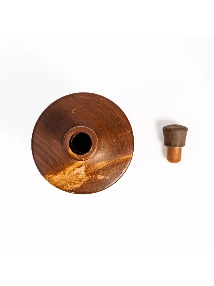 Деревянный графин для жидкости из сибирского кедра. Плюсом такого сосуда является натуральность материала: его не обрабатывают химическими средствами, красками и т.д. В таких сосудах удобно хранить лечебные настойки, алкоголь по истечении полугода после изготовления. Дубильные вещества, которыми богата древесина кедра, используемая для производства сосуда, обогащают вкус и аромат жидкости. Также дерево обладает природными антисептическими свойствами, которые улучшают качество жидкости, дополнительно "обеззараживая" ее, и жидкость в сосуде не покрывается плесенью. Древесина кедра хорошо выдерживает высокую влажность, не трескается и не вздувается при высыхании. Пропитаны составом из растительного масла пчелиного воска и кедровой смолы! Чудесный запах дерева! Ручная работа! Для алкогольных напитков, настоек, лекарств и пр. Размер: высота 16 см., диаметр 10 см., объем 500 мл.