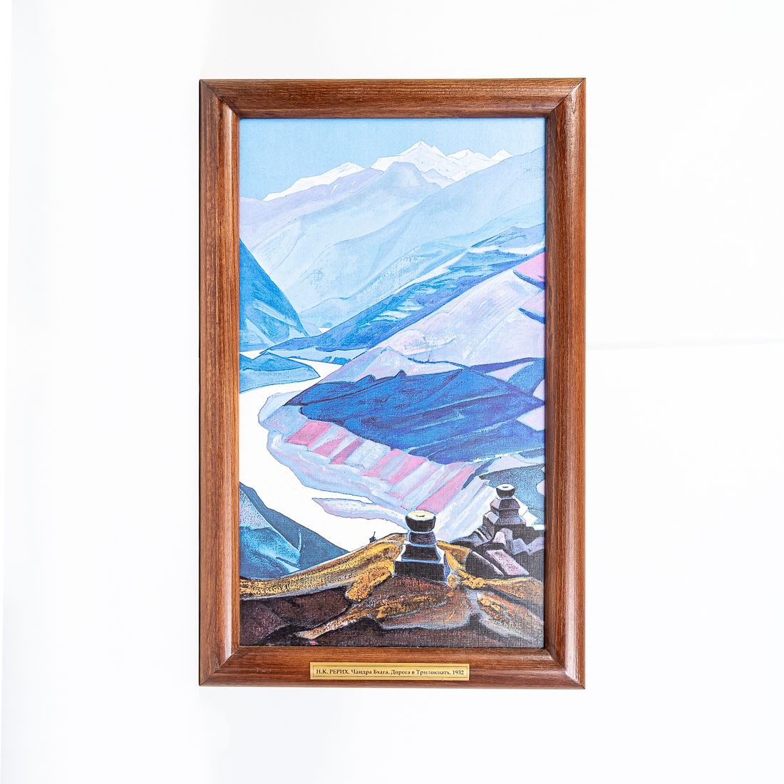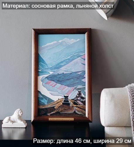 Репродукция картины в раме "Чандра Бхага. Дорога в Трилокнатх. 1932" Николая Константиновича Рерих. Репродукция печатается на льне, при печати используются экологически чистые пигментные чернила, рекомендованные для использования в жилых помещениях. Холст вставляется в рамку, изготовленную из натурального дерева сибирская сосна. Размер картины высота 460 мм., длина 290 мм. "И опять течет речь об изображениях на скалах, о нечитаемых надписях, о каменных могилах и о сокрытых книгах священных. Кроме мест в долине Кулу называется еще место около Трилокнатха, где, по преданию скрыты книги во время гонений свирепого Ландармы. Есть на горах и развалины каких-то древних жилищ."Н.К. Рерих"Путь в Трилокнатх рождает и ещё одно яркое воспоминание. К древней святыне, к месту паломничества и молитвы тянутся вереницы садху и лам. От разных путей сошлись они здесь. Кто с трезубцем, кто с тростью бамбука, а кто и вовсе безо всего, и без одежды, совершает духовное хождение. Снега перевала Ротанга им нипочем". Н.К. Рерих