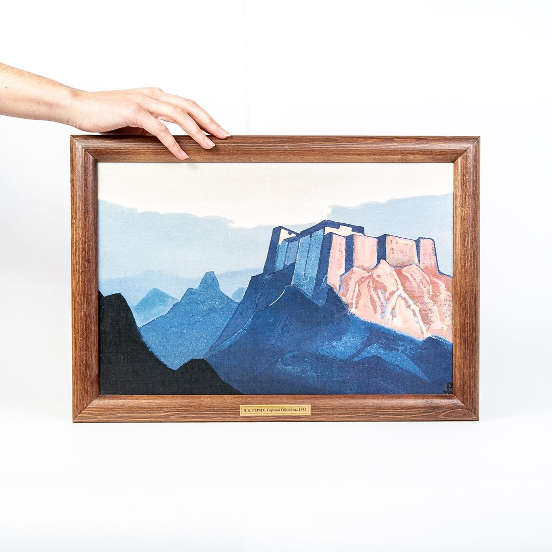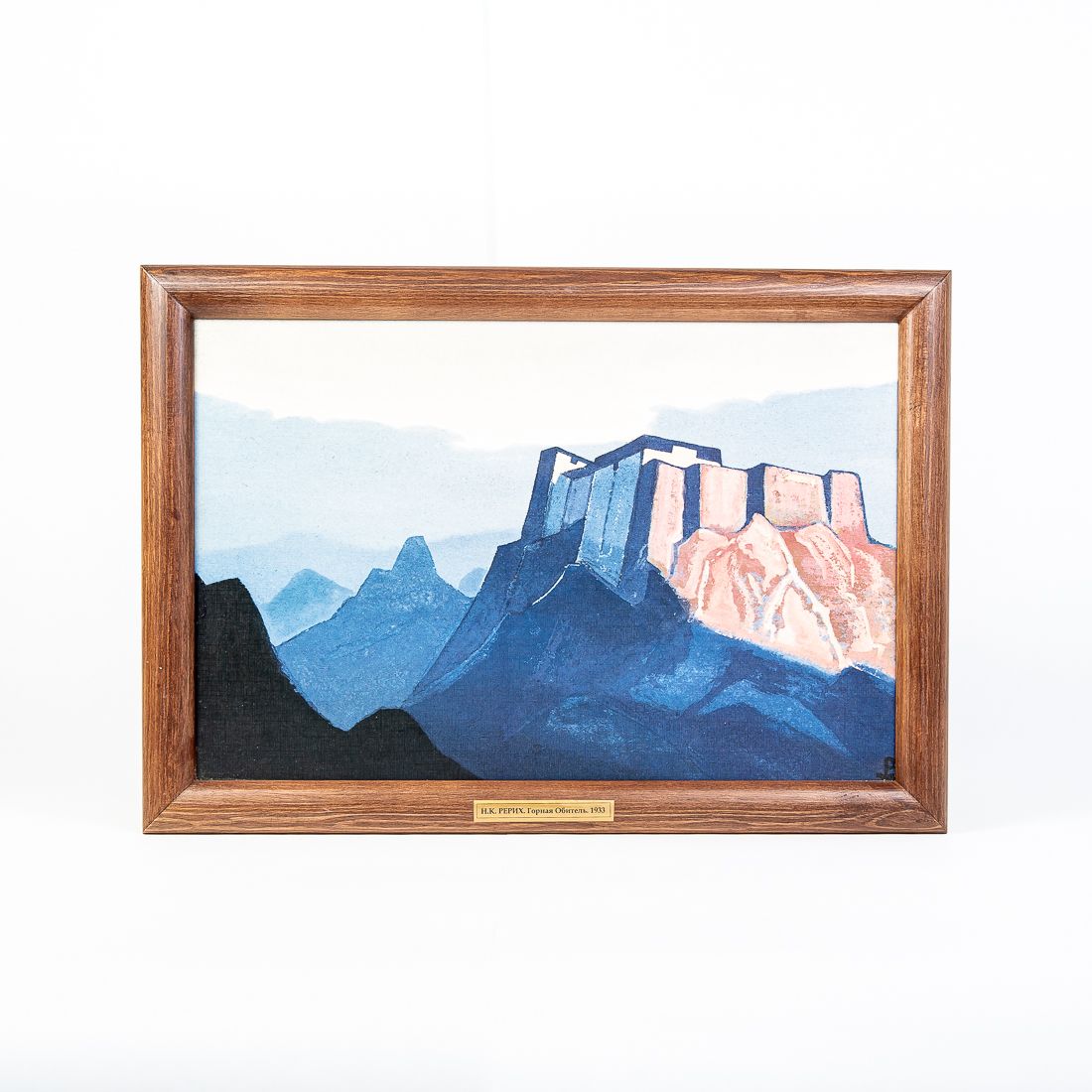 Репродукция картины в раме «Горная обитель. 1933» Николая Константиновича Рериха. Репродукция печатается на льне, при печати используются экологически чистые пигментные чернила, рекомендованные для использования в жилых помещениях. Холст вставляется в рамку, изготовленную из натурального дерева сибирская сосна. Размер картины высота 320 мм., длина 460 мм.«...Двигаясь дальше, вы привыкаете к этим романтическим памятникам и постройкам, взлетевшим, как орлы, на безводные вершины. Но первое впечатление, как всегда, бывает самое поражающее. Нужно было иметь и чувство красоты, и мужественную самоотверженность, чтобы укрепляться на таких высотах. Во многих подобных безводных домах в скалах были пробиты подземные ходы к реке, чтобы мог пройти груженый ослик. Эта сказка подземных ходов, как увидим, сложила многие, самые лучшие предания».(Н.К. Рерих. Сердце Азии)