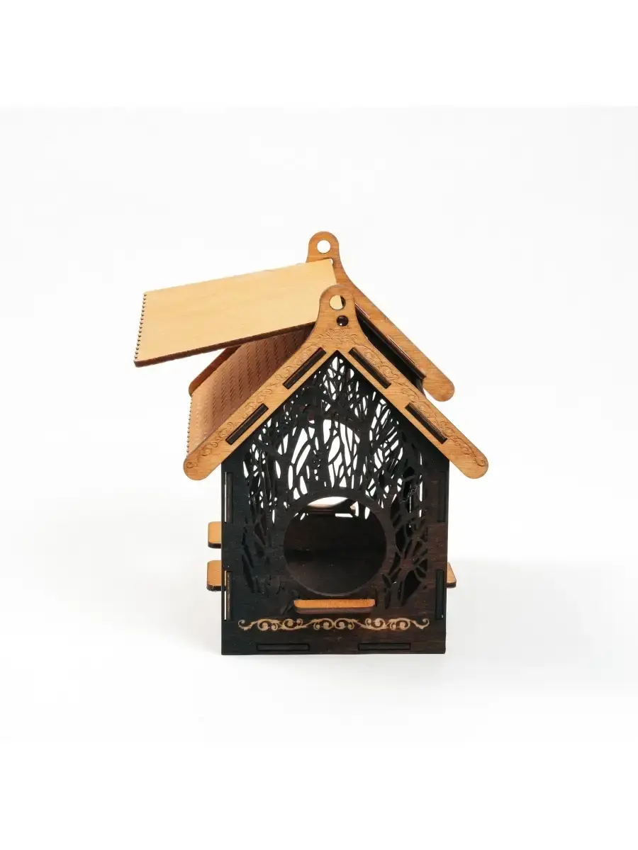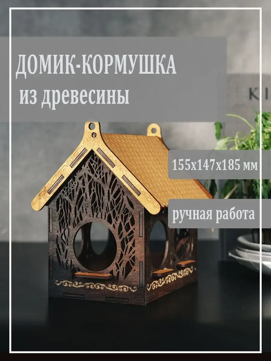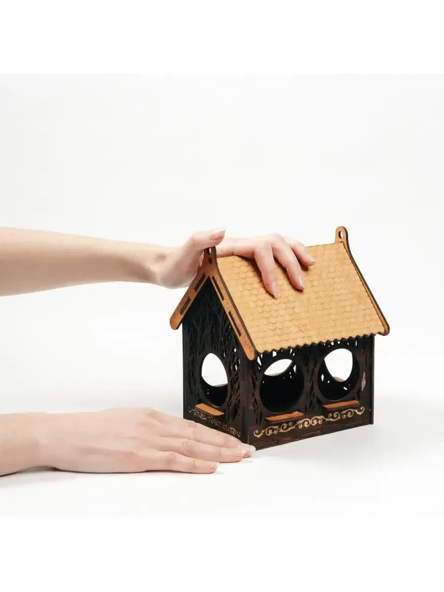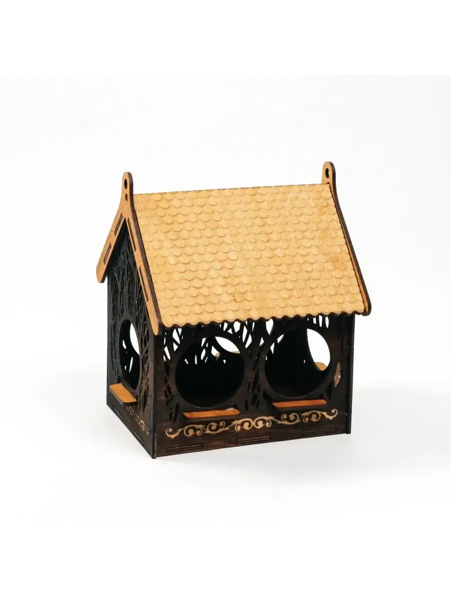 Кормушка-домик для птиц из натурального дерева. Ручной работы. Выполнена из натурального дерева - 100% экологически чистых материалов. Кормушка для птиц стает оригинальным подарком для детей и взрослых. Размер: 155х147х185 мм.