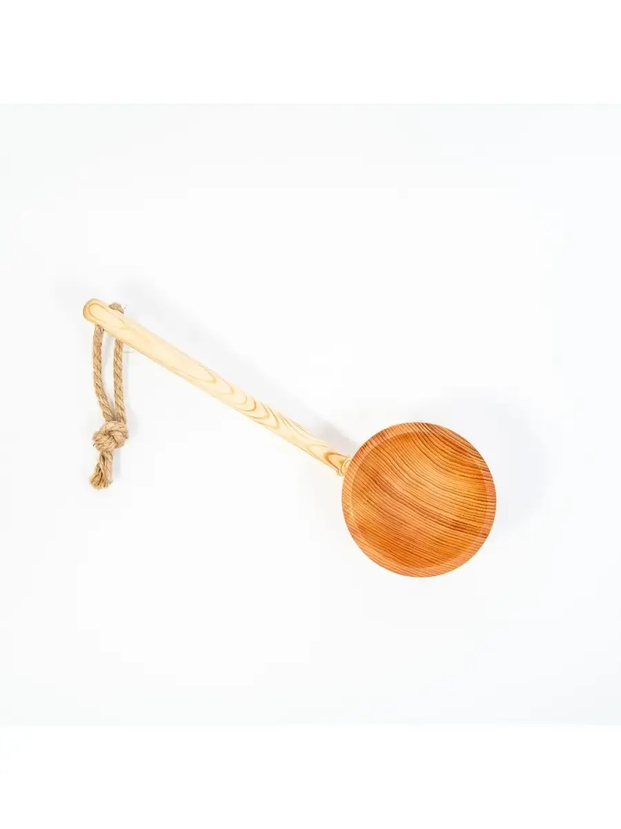 Ковш для подачи пара в бане из сибирского кедра. Изготовлен из дерева сибирского кедра. Чтобы продлить срок эксплуатации, ковш покрыт составом из пчелиного воска, растительного масла и кедровой смолы. Длинная ручка даёт возможность держать руку на безопасном расстоянии и предохраняет от ожога паром, в момент, когда вы плеснете воду на раскаленные камни. При этом ковш имеет небольшой объем, порядка 500 мл, именно такое количество воды выплескивается за раз на камни. Размер: длина ковша 400 мм., диаметр черпака 140 мм., высота 100 мм.