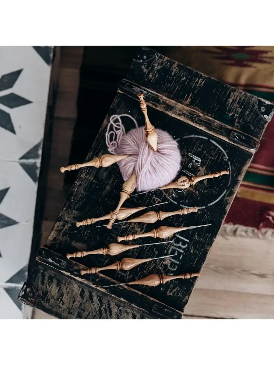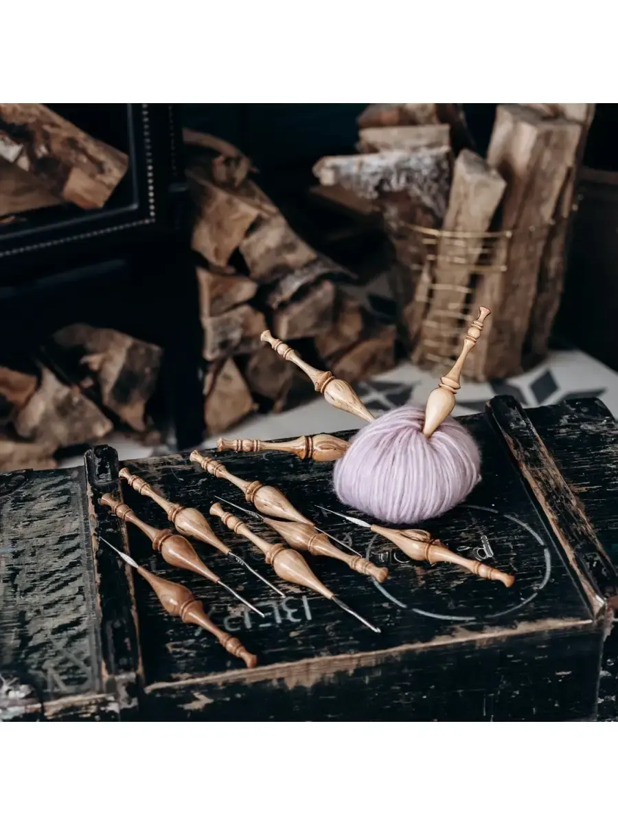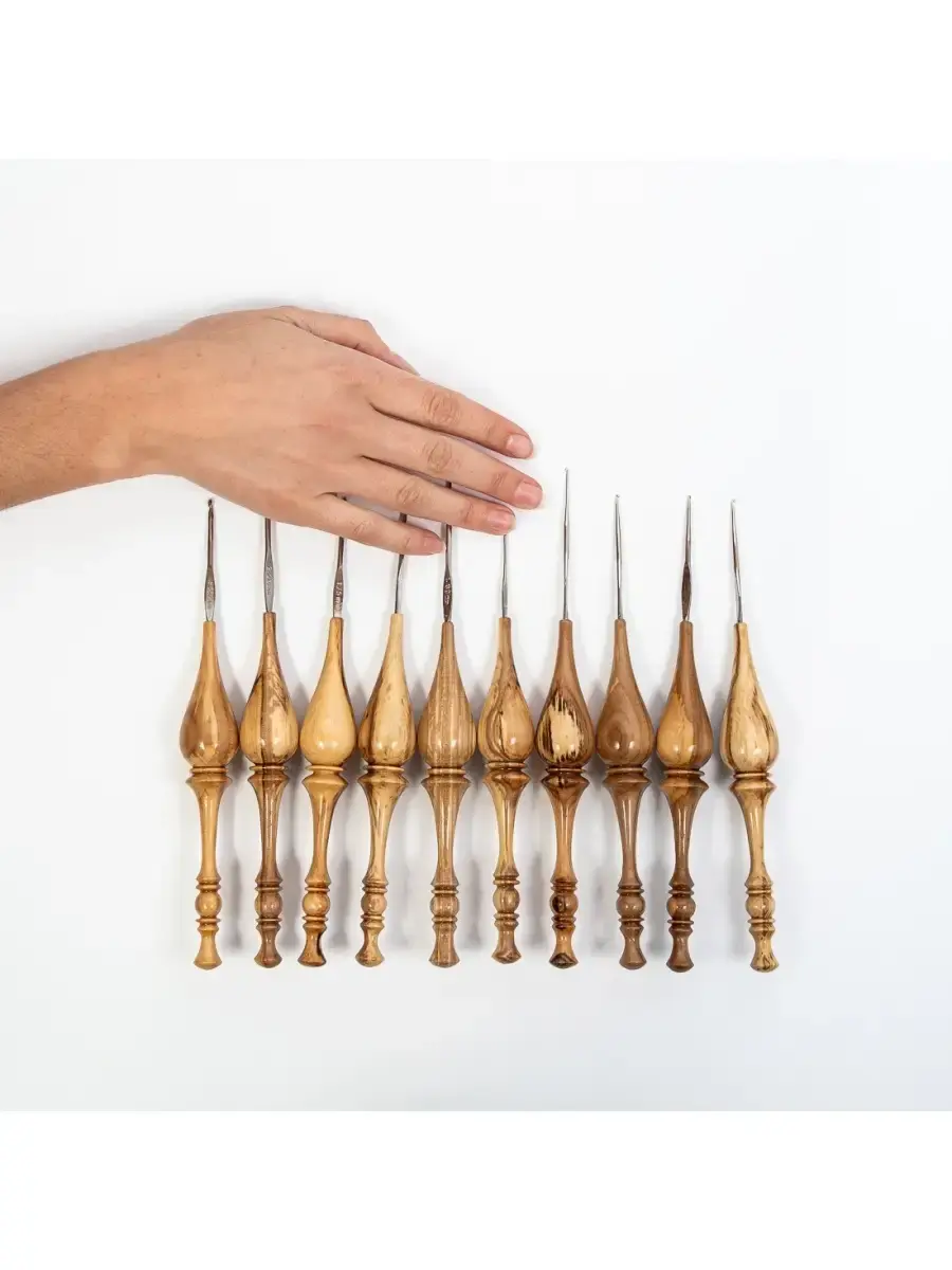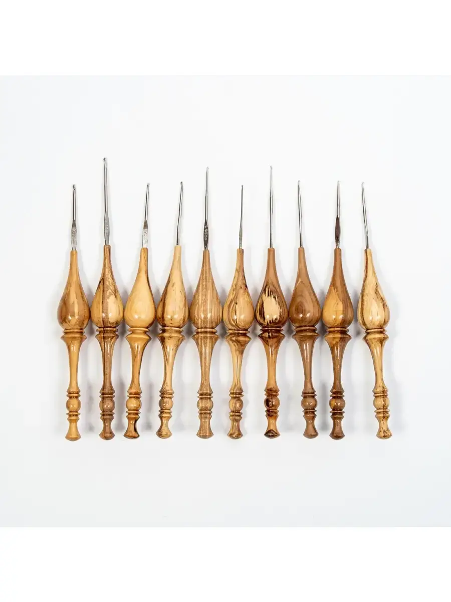 **Набор железных крючков для вязания с деревянной ручкой (10 шт).** Возможно различие в рисунке текстуры дерева. Легкие, приятные на ощупь, эргономичные, приятно лежат в руке. Очень важно выбрать крючок для вязания, от этого зависит качество изделия. Неправильно подобранный крючок может испортить вещь уже в начале работы. Очень хороши для вязания деревянные крючки. Может стать хорошим сувениром-подарком для рукодельницы, как по прямому назначению, так и в виде сувенира или украшения в интерьере, а также как деталь костюма для кукол в русском наряде. Размеры: 0.6, 0.8, 0.9, 1, 1.25, 1.3, 1.6, 1.7, 2.0, 3.0 мм.200 мм х 25 мм.