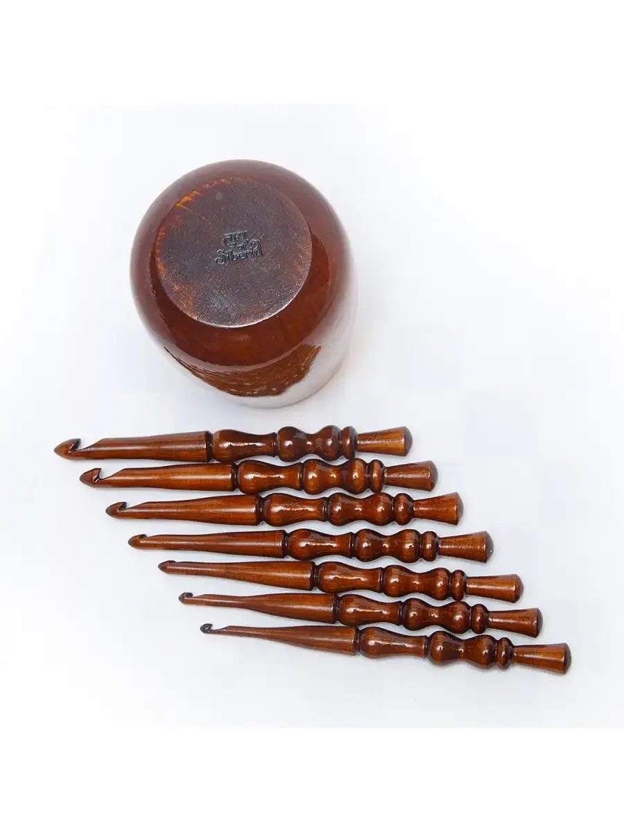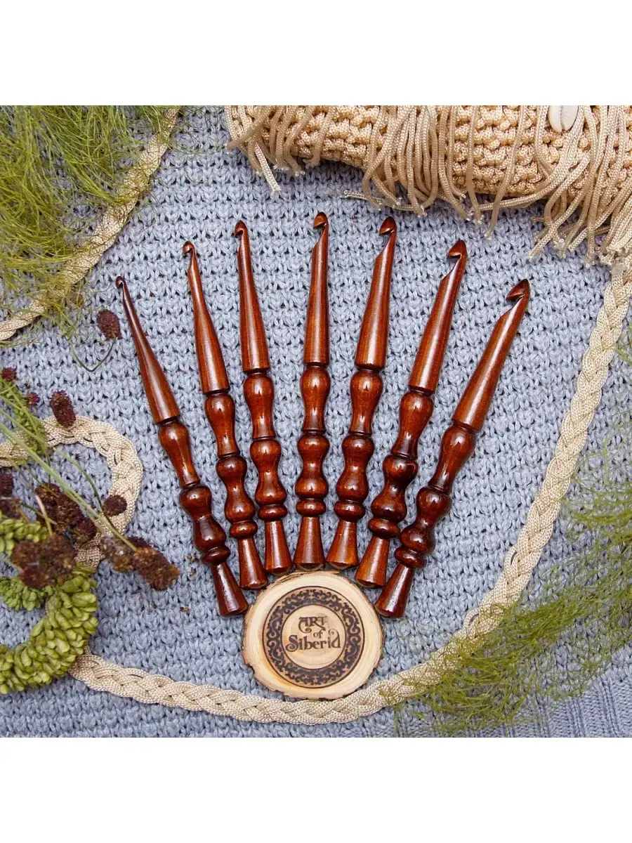 Набор деревянных крючок для вязания из кедра с вазой. (набор 7шт 4-10мм + ваза). Легкие, приятные на ощупь, эргономичные, тщательно отполированы и покрыты лаком! Маленький русский крючок также может стать хорошим подарком для рукодельницы, как по прямому назначению, так и в виде сувенира или украшения в интерьере, а так же как деталь костюма для кукол в русском наряде. Размер: Ваза: высота 120 мм, диаметр 95 мм.Крючки: длина 170 мм, диаметр 16 мм. 4-10 мм.
