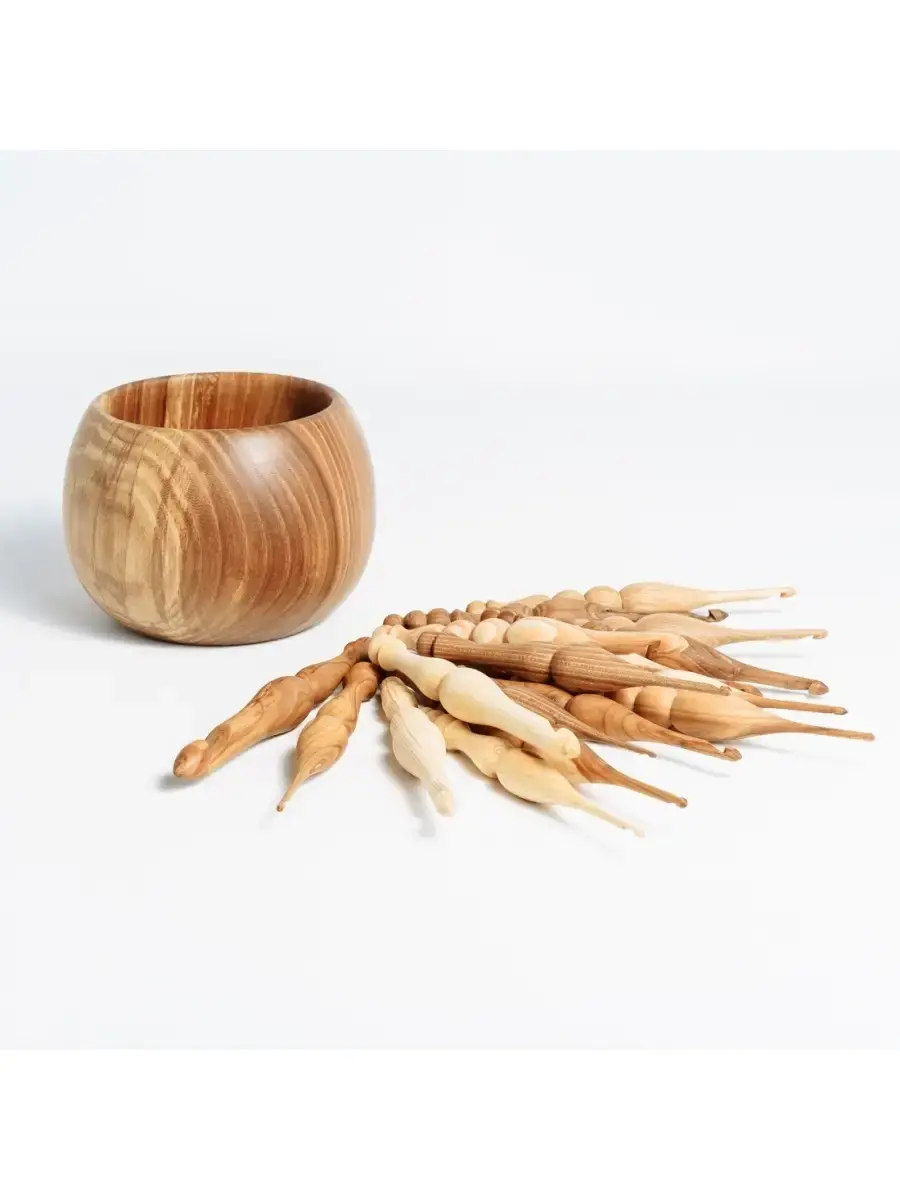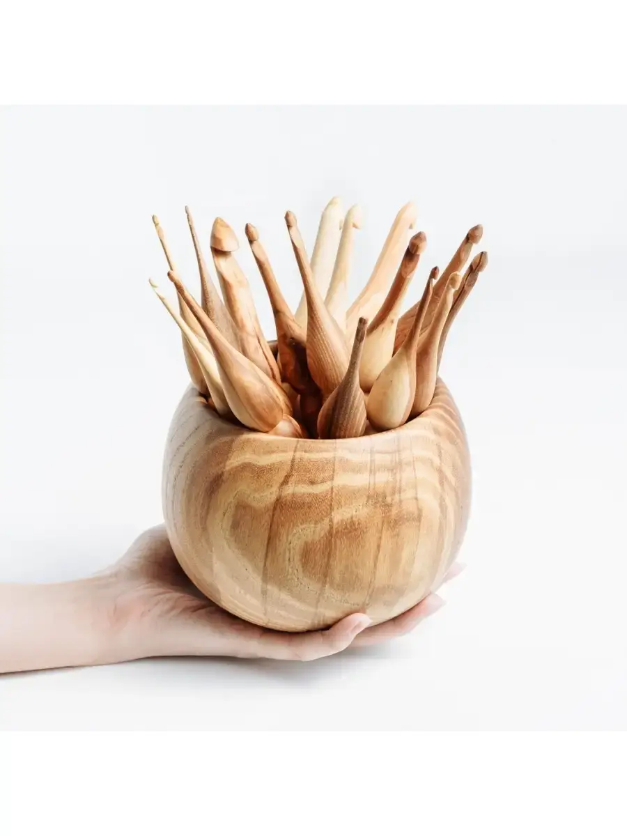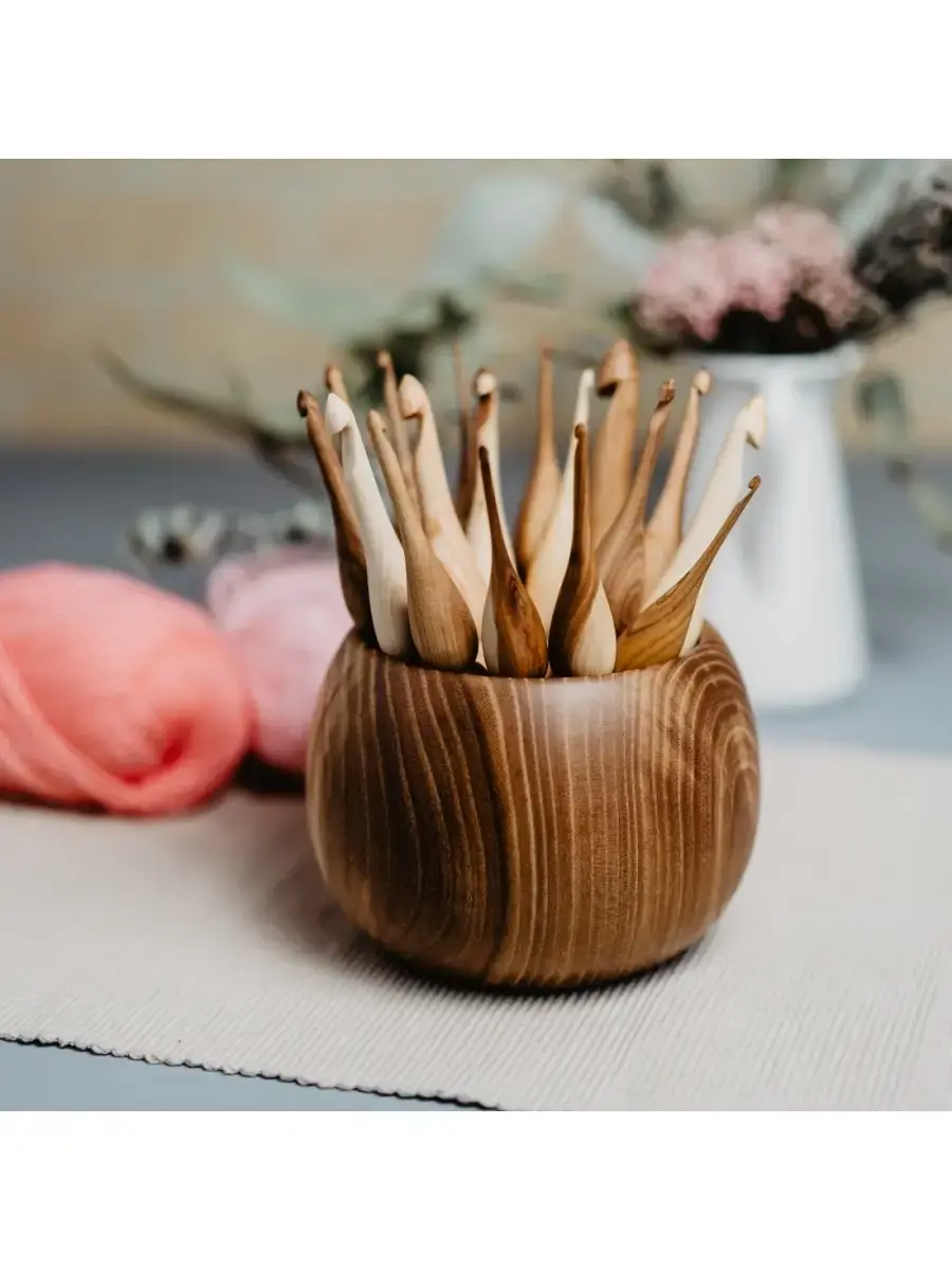 Вязальные крючки (17 шт) из разных пород древесины в комплекте с клубочницей. Крючки изготовлены из разных пород дерева (Яблоня, Вяз, Боярышник, Вишня, Сибирский Кедр, Слива, Черемуха, Береза, Ирга)а клубочница - из Вяза. В наборе 17 крючков. Легкие, приятные на ощупь, эргономичные, тщательно отполированы! Покрыты экологически чистым пчелиным воском с льняным маслом!!! Широкий размерный ряд поможет создавать различные изделия из любой пряжи! А удобная клубочница позволит хранить крючки и пряжу в одном месте! Размер: Крючки (мм): 2.5, 3, 3.25, 3.5, 3.75, 4.25, 4.5, 5, 5.5, 6, 6.5, 7, 8, 9, 10, 12, 15. длина 16,5-17см, ширина 1,9-2,3см. Клубочница: высота 11 см, диаметр 15 см.