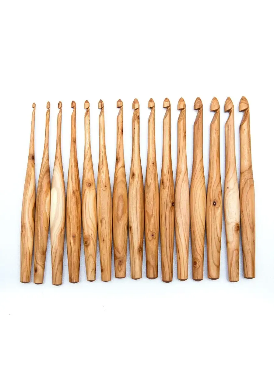 Набор деревянных крючков для вязания 15 шт (3-10 мм). Из натурального дерева Сибирской Вишни! Легкие, приятные на ощупь, эргономичные, тщательно отполированы! Покрыты экологически чистым пчелиным воском с льняным маслом!!! Широкий размерный ряд помогает создавать различные изделия из любой пряжи! Прекрасный подарок рукодельнице! Размер: Крючки (мм): 3, 3.5, 4, 4.5, 5, 5.5, 6, 6.5, 7, 7.5, 8, 8.5, 9, 9.5, 10. длина 165 мм, ширина 14 мм.
