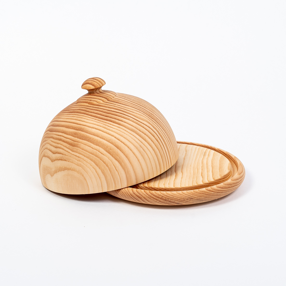 На фото – масленка из дерева сибирского кедра. Экологична, практична, имеет красивый внешний вид. Маленькие бортики обеспечивают фиксацию крышки, не давая ей соскальзывать, и помогают плотно прилегать к тарелочке, чтобы масло не впитало посторонние запахи. А удобная ручка легко позволяет взяться за нее и открыть масленку.
