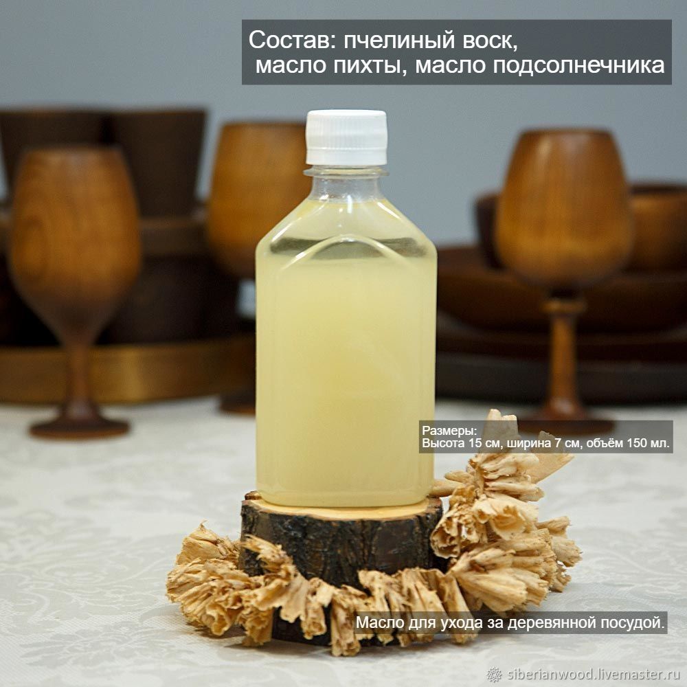 Масло натуральное для ухода за деревянной посудой. Предназначено для обработки и защиты предметов из натуральной древесины. Рекомендуется обрабатывать посуду из дерева 1 раз в месяц. Перед обработкой помойте и просушите изделие. затем добавьте на изделие небольшое количество масла и протрите его со всех сторон. Через несколько часов после покрытия масло подсохнет, закроет поры древесины и не даст изделию впитывать воду.