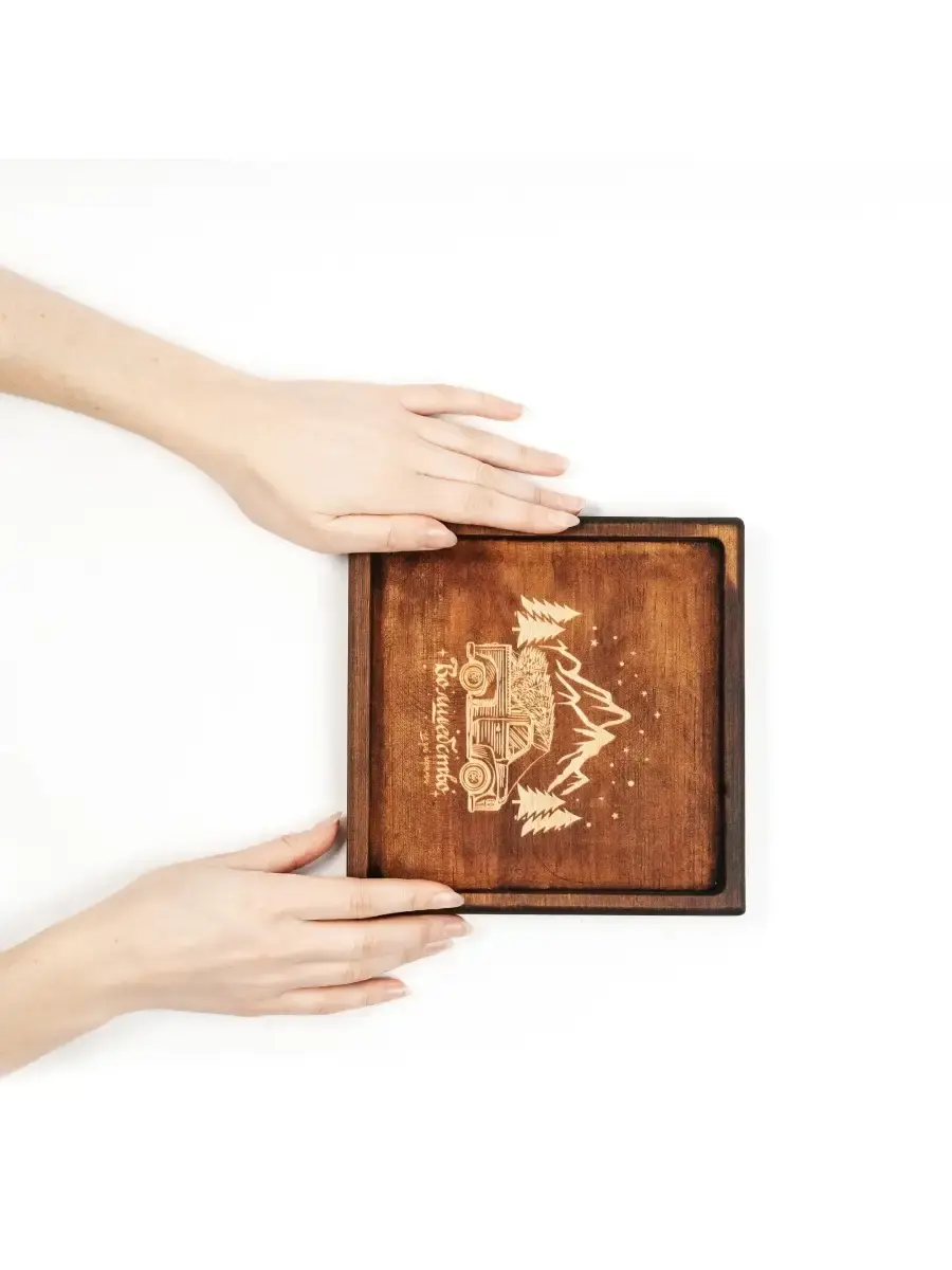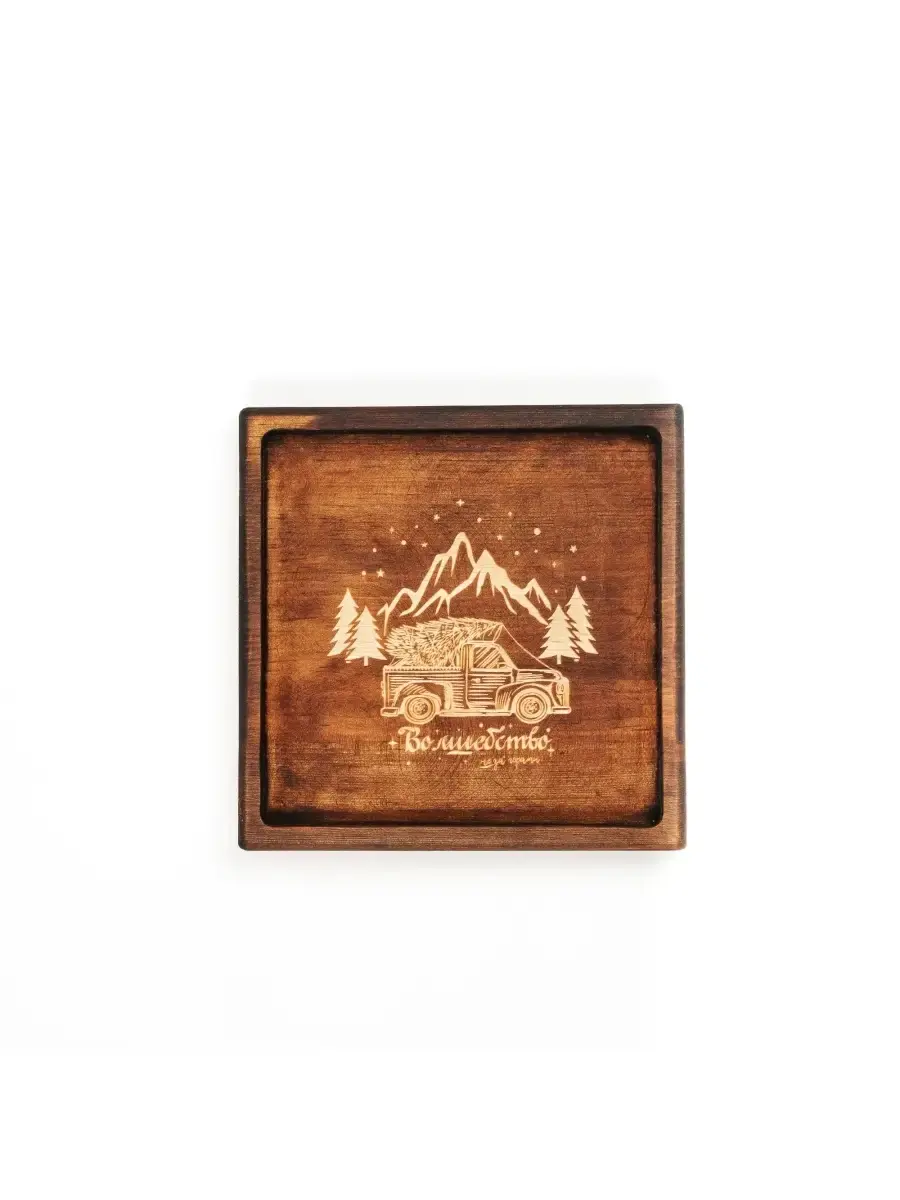 Деревянная менажница из кедра для подачи блюд и закусок с гравировкой "Волшебство не за горами". Представлено в двух вариантах: обжиг и цвет "орех". Любителям натуральности придется по душе наша деревянная менажница, имеющая такие плюсы, как красивый узор древесины, не бьется, натуральна, долговечна и подходит для различных блюд. А антибактериальные свойства кедра привлекают ценителей чистоты. Возможно наличие сучков. Пропитана нашим составом на основе растительного масла, кедровой смолы и пчелиного воска. Размер: 19х19х2,2 см.