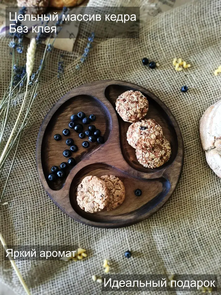 Менажница деревянная цельная из Сибирского кедра ручной работы для кухни. Выполнена из 100% массива, полностью цельная. Многие хозяйки мечтают, чтобы ее семейный обед или праздничный ужин был таким, как в престижном дорогом ресторане, поэтому озадачиваются сервировкой и красивой подачей блюд. В этом случае можно воспользоваться нашей новинкой - менажница для подачи блюд! Слово французского происхождения, от melanger – «смешивать», то есть в буквальном смысле менажница – это тарелка, на которой смешаны разные блюда. Наша экологичная посуда из дерева придется по душе каждому, кто любит вкусно поесть и получить удовольствие от еды. Деревянная менажница для сервировки обладает следующими преимуществами: красивая текстура древесины, очень прочная, натуральная и долговечная. Фитонциды, входящие в состав кедровой древесины, имеют антибактериальные свойства. Они способны обеззараживать воздух, убивать простейшие микроорганизмы и вирусы. Поднос из дерева станет отличным подарком на Новый год, день рождения и новоселье. Менажница подходит для горячих и холодных блюд, для сыра, для закусок и фруктов. Возможно наличие сучков. Идеальная шлифовка позволяет изделию быть очень гладким. Менажница пропитана натуральным маслом, которое, необходимо смыть в теплой проточной воде перед использованием. Не замачивать! Не использовать в посудомоечной машине! Только деликатная мойка. После использования насухо вытереть.