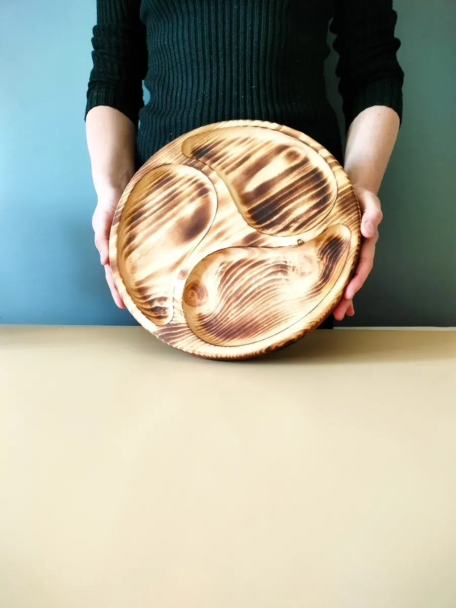 Менажница деревянная цельная из Сибирского кедра ручной работы для кухни. Выполнена из 100% массива, полностью цельная. Многие хозяйки мечтают, чтобы ее семейный обед или праздничный ужин был таким, как в престижном дорогом ресторане, поэтому озадачиваются сервировкой и красивой подачей блюд. В этом случае можно воспользоваться нашей новинкой - менажница для подачи блюд! Слово французского происхождения, от melanger – «смешивать», то есть в буквальном смысле менажница – это тарелка, на которой смешаны разные блюда. Наша экологичная посуда из дерева придется по душе каждому, кто любит вкусно поесть и получить удовольствие от еды. Деревянная менажница для сервировки обладает следующими преимуществами: красивая текстура древесины, очень прочная, натуральная и долговечная. Фитонциды, входящие в состав кедровой древесины, имеют антибактериальные свойства. Они способны обеззараживать воздух, убивать простейшие микроорганизмы и вирусы. Поднос из дерева станет отличным подарком на Новый год, день рождения и новоселье. Менажница подходит для горячих и холодных блюд, для сыра, для закусок и фруктов. Возможно наличие сучков. Идеальная шлифовка позволяет изделию быть очень гладким. Менажница пропитана натуральным маслом, которое, необходимо смыть в теплой проточной воде перед использованием. Не замачивать! Не использовать в посудомоечной машине! Только деликатная мойка. После использования насухо вытереть.