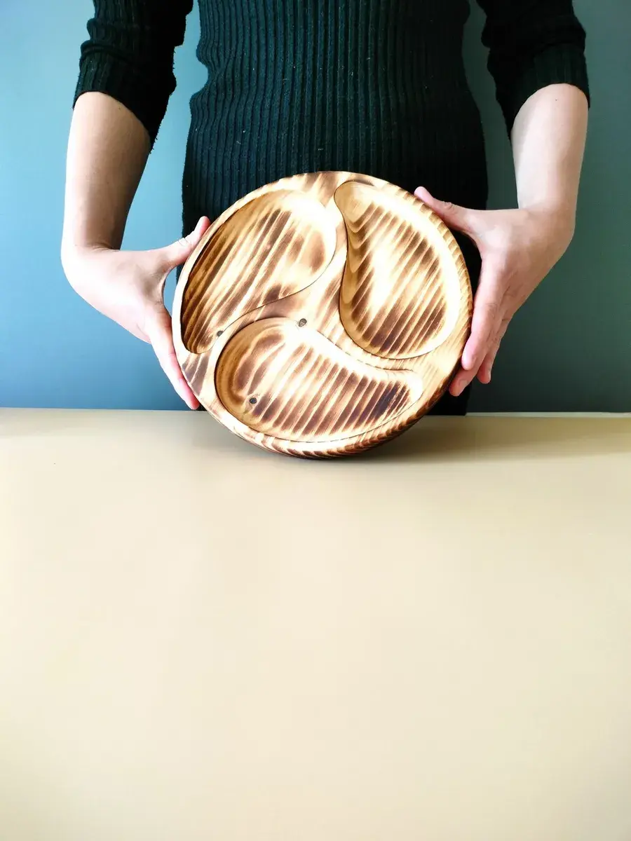 Менажница деревянная цельная из Сибирского кедра ручной работы для кухни. Выполнена из 100% массива, полностью цельная. Многие хозяйки мечтают, чтобы ее семейный обед или праздничный ужин был таким, как в престижном дорогом ресторане, поэтому озадачиваются сервировкой и красивой подачей блюд. В этом случае можно воспользоваться нашей новинкой - менажница для подачи блюд! Слово французского происхождения, от melanger – «смешивать», то есть в буквальном смысле менажница – это тарелка, на которой смешаны разные блюда. Наша экологичная посуда из дерева придется по душе каждому, кто любит вкусно поесть и получить удовольствие от еды. Деревянная менажница для сервировки обладает следующими преимуществами: красивая текстура древесины, очень прочная, натуральная и долговечная. Фитонциды, входящие в состав кедровой древесины, имеют антибактериальные свойства. Они способны обеззараживать воздух, убивать простейшие микроорганизмы и вирусы. Поднос из дерева станет отличным подарком на Новый год, день рождения и новоселье. Менажница подходит для горячих и холодных блюд, для сыра, для закусок и фруктов. Возможно наличие сучков. Идеальная шлифовка позволяет изделию быть очень гладким. Менажница пропитана натуральным маслом, которое, необходимо смыть в теплой проточной воде перед использованием. Не замачивать! Не использовать в посудомоечной машине! Только деликатная мойка. После использования насухо вытереть.