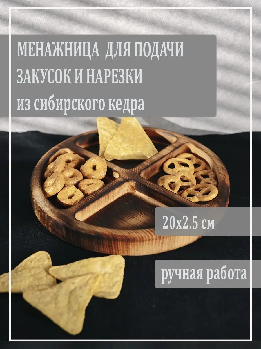 Деревянная менажница из кедра для подачи блюд и закусок! Любителям натуральности придется по душе наша деревянная менажница, имеющая такие плюсы, как красивый узор древесины, не бьется, натуральна, долговечна и подходит для различных блюд. А антибактериальные свойства кедра привлекают ценителей чистоты. Подходит для любого застолья! Пропитана нашим составом на основе растительного масла, кедровой смолы и пчелиного воска. Полностью экологичный продукт! Размер: диамерт 20 см, высота 2,5 см.