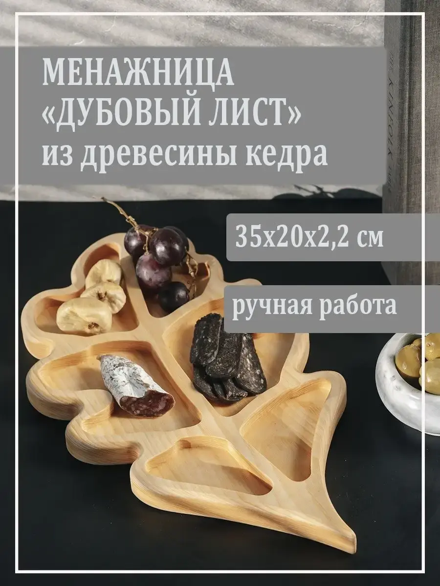 Деревянная менажница из кедра для подачи блюд и закусок. Любителям натуральности придется по душе наша деревянная менажница, имеющая такие плюсы, как красивый узор древесины, не бьется, натуральна, долговечна и подходит для различных блюд. Возможно наличие сучков. Пропитана нашим составом на основе растительного масла, кедровой смолы и пчелиного воска. Перед использованием обязательно промыть теплой проточной водой, чтоб смыть остатки масла и морилки. Изделие может стать чуть светлее. Первое время возможно оставление следов от морилки, поэтому лучше для протирания использовать бумажные полотенца. Размер: 35х20х2,2 см.