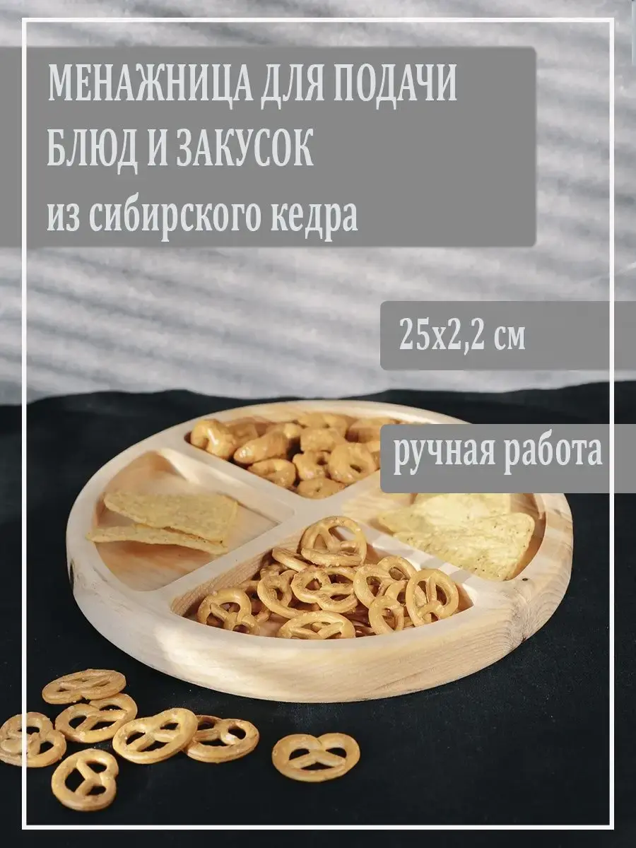 Деревянная менажница из кедра для подачи блюд и закусок! Любителям натуральности придется по душе наша деревянная менажница, имеющая такие плюсы, как красивый узор древесины, не бьется, натуральна, долговечна и подходит для различных блюд. А антибактериальные свойства кедра привлекают ценителей чистоты. Подойдет для любого застолья! Пропитана нашим составом на основе растительного масла, кедровой смолы и пчелиного воска. Полнотью экологичный продукт! Рахмер: диамерт 25 см, высота 2,5 см.