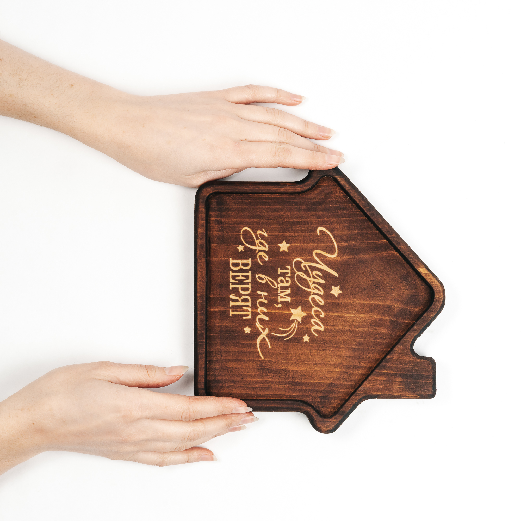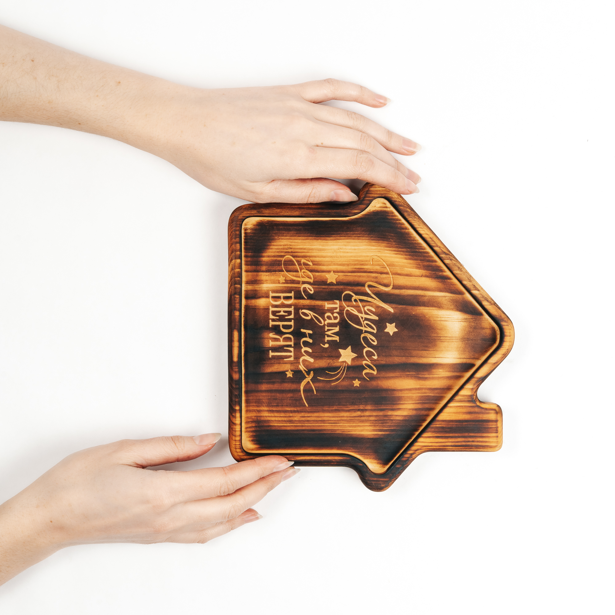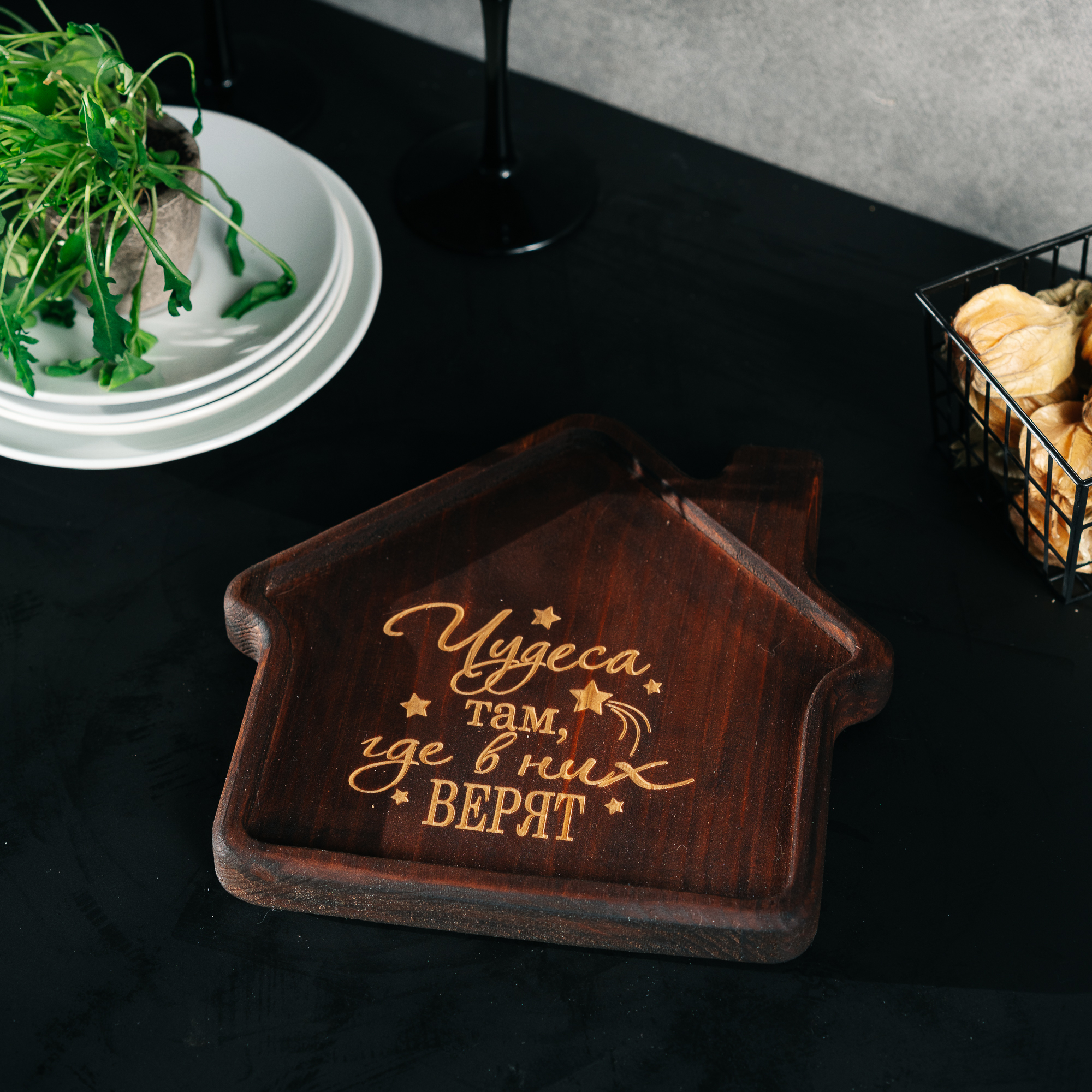 Менажница из кедра для подачи блюд и закусок с гравировкой "Чудеса там, где в них верят". Любителям натуральности придется по душе наша деревянная менажница, имеющая такие плюсы, как красивый узор древесины, не бьется, натуральна, долговечна и подходит для различных блюд. А антибактериальные свойства кедра привлекают ценителей чистоты. Подходит для любых видов закусок: от мясной нарезки до конфет! Пропитана нашим составом на основе растительного масла, кедровой смолы и пчелиного воска.